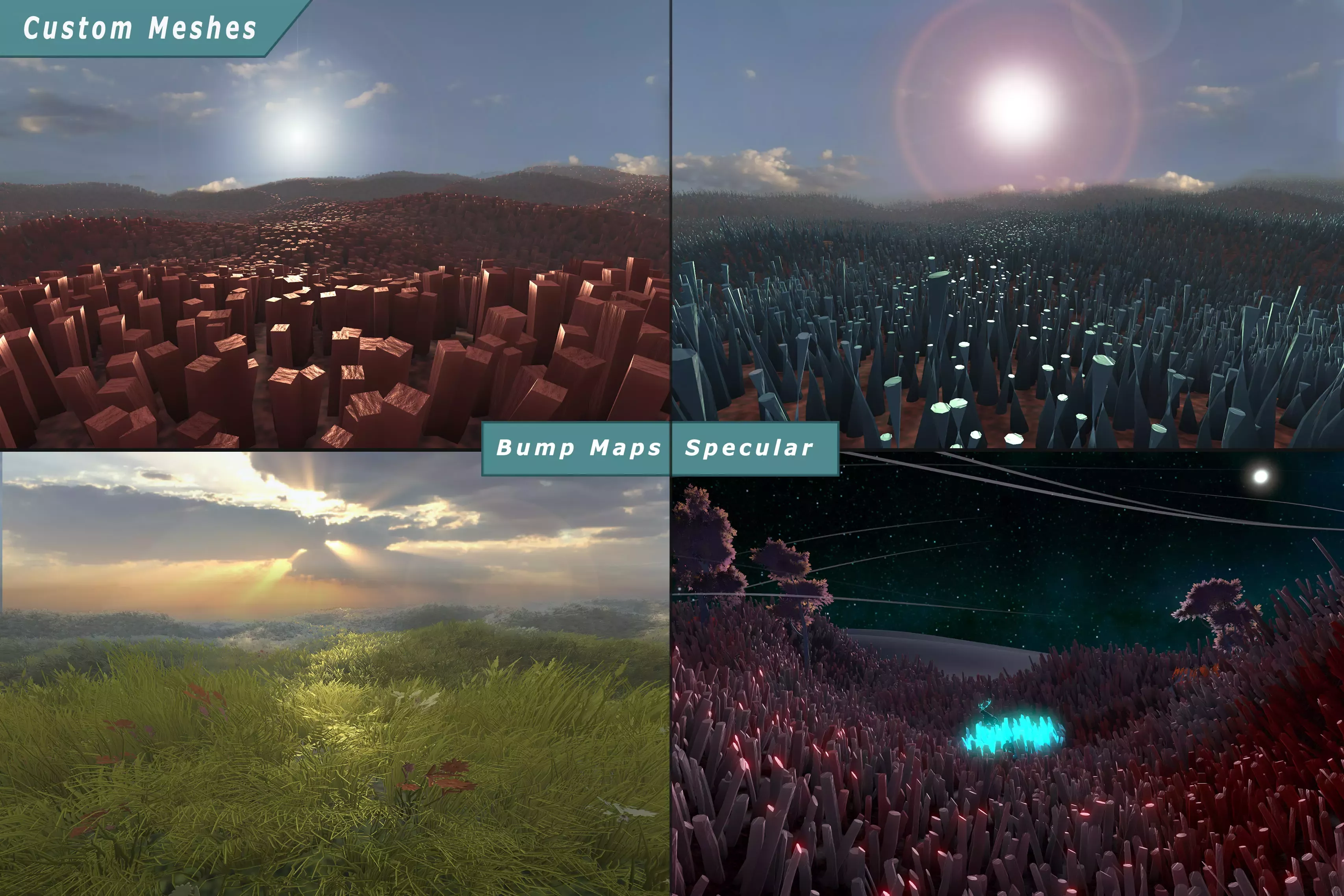 ~ Поддерживает использование пользовательских 3D-сеток для рисования травы.
