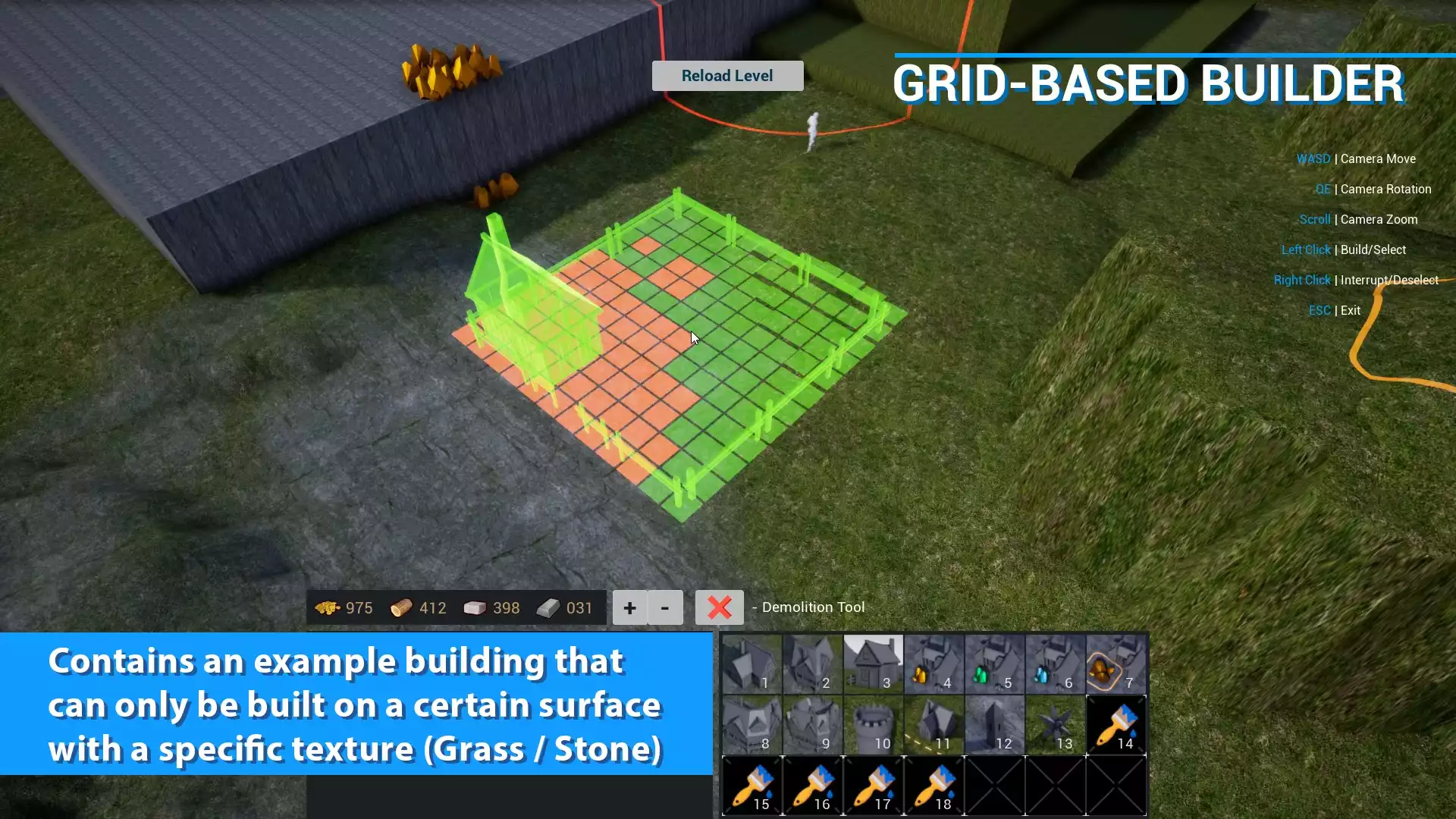 • Содержит пример здания, которое можно построить только на определенной поверхности с определенной текстурой (трава/камень).