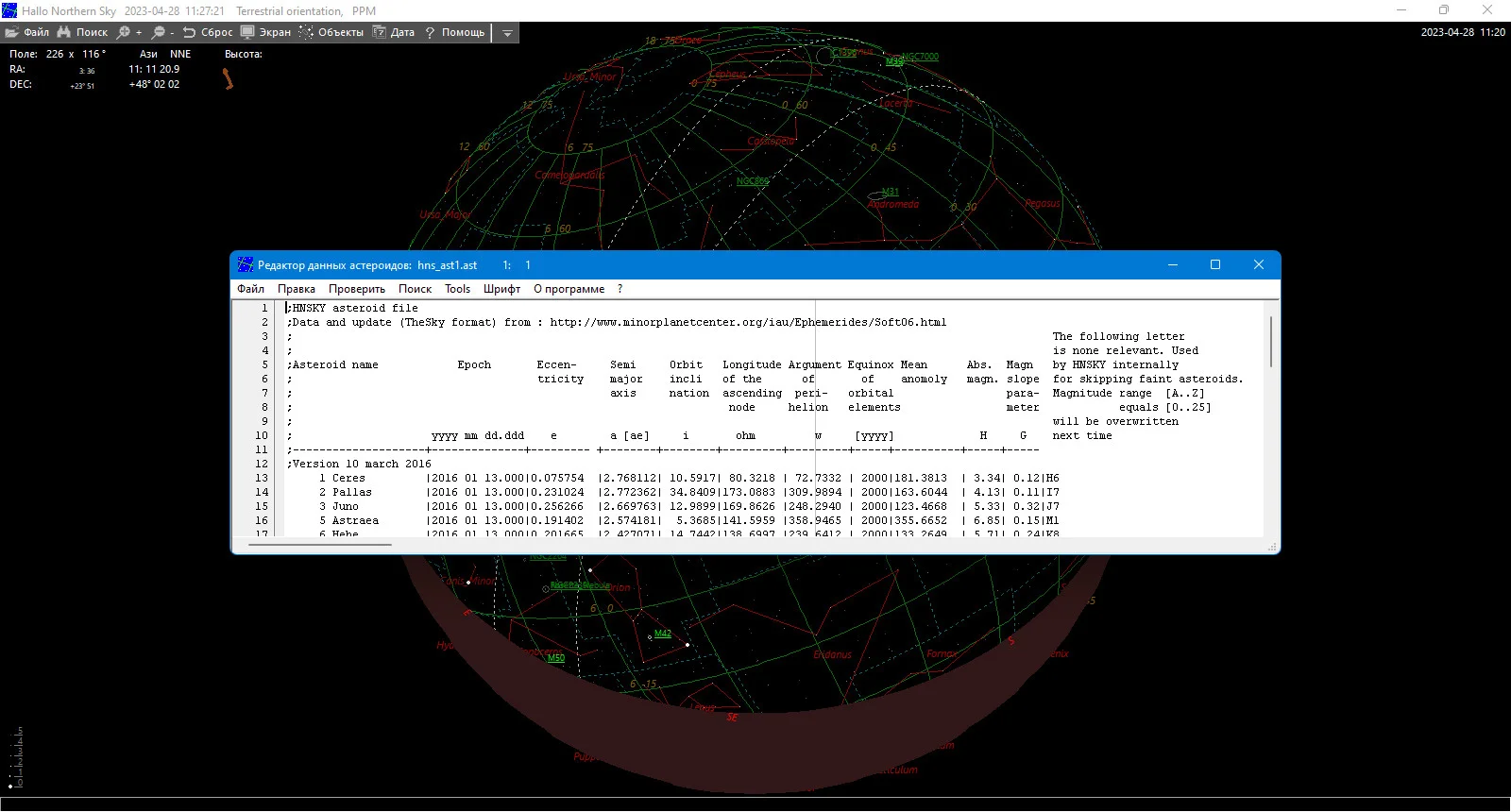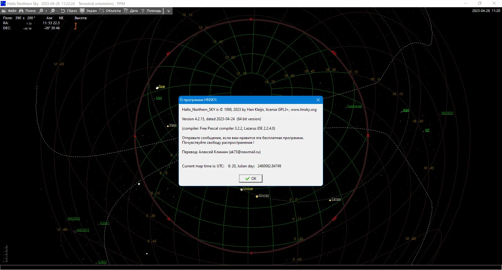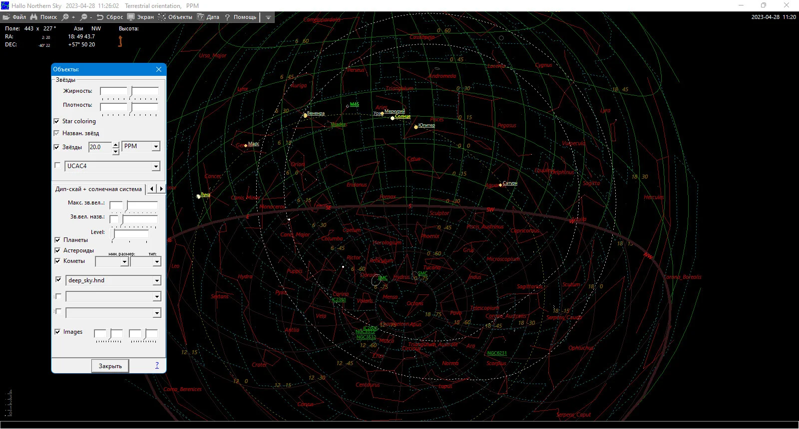Hallo Northern Sky (HNSKY) – это мощный планетарий для астрономов-любителей и всех, кто интересуется изучением звездного неба. Программа позволяет виртуально перемещаться по небесной сфере, просматривать созвездия, планеты и другие объекты.