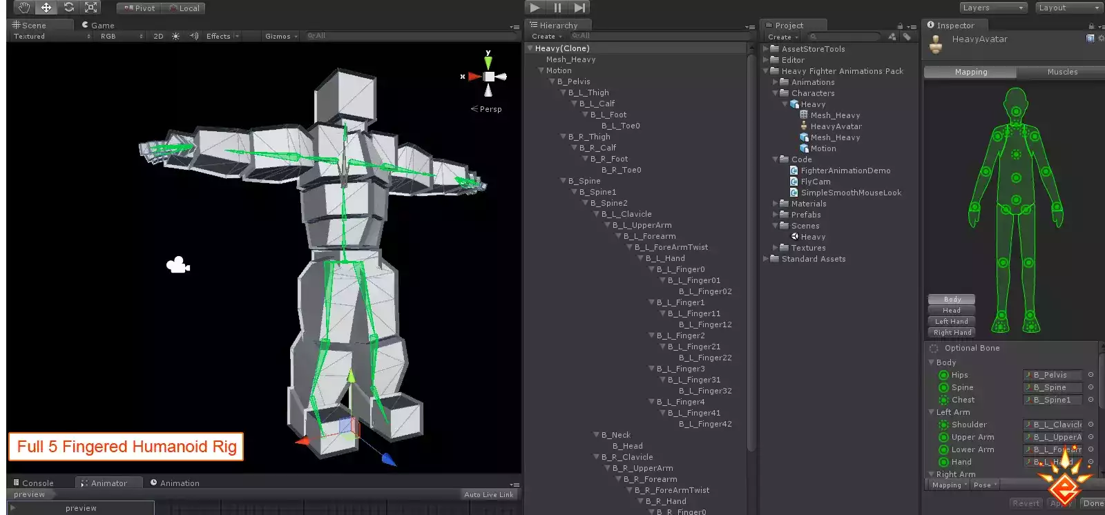 -Полный скелет гуманоида-меканима с полной поддержкой руки на 5 пальцев.