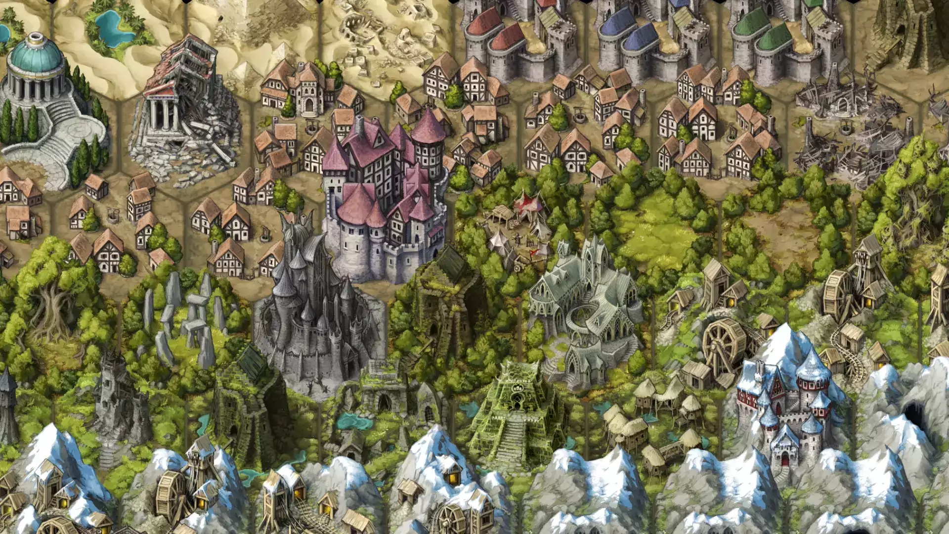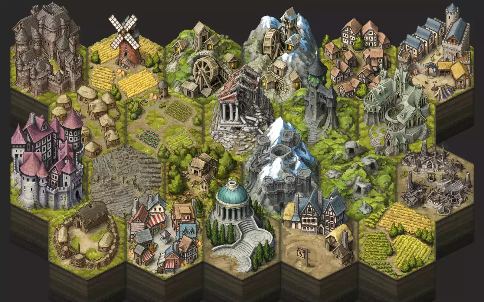 - нарисовано в разрешении 256x384 пикселей, чтобы башни, горы и деревья могли перекрывать плитки позади.