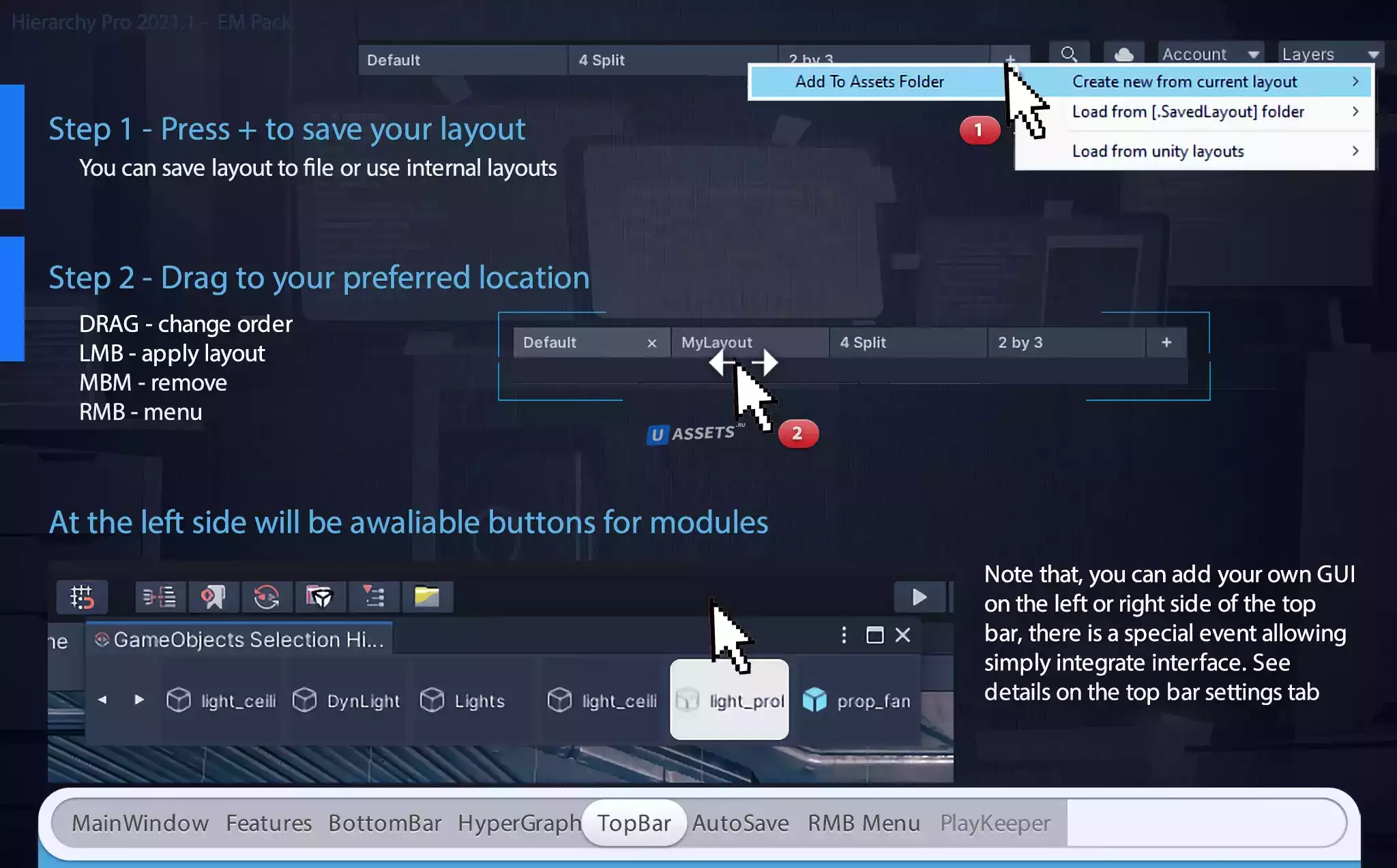 Этот режим интегрирован в меню gameobject и включает в себя примеры таких элементов, как