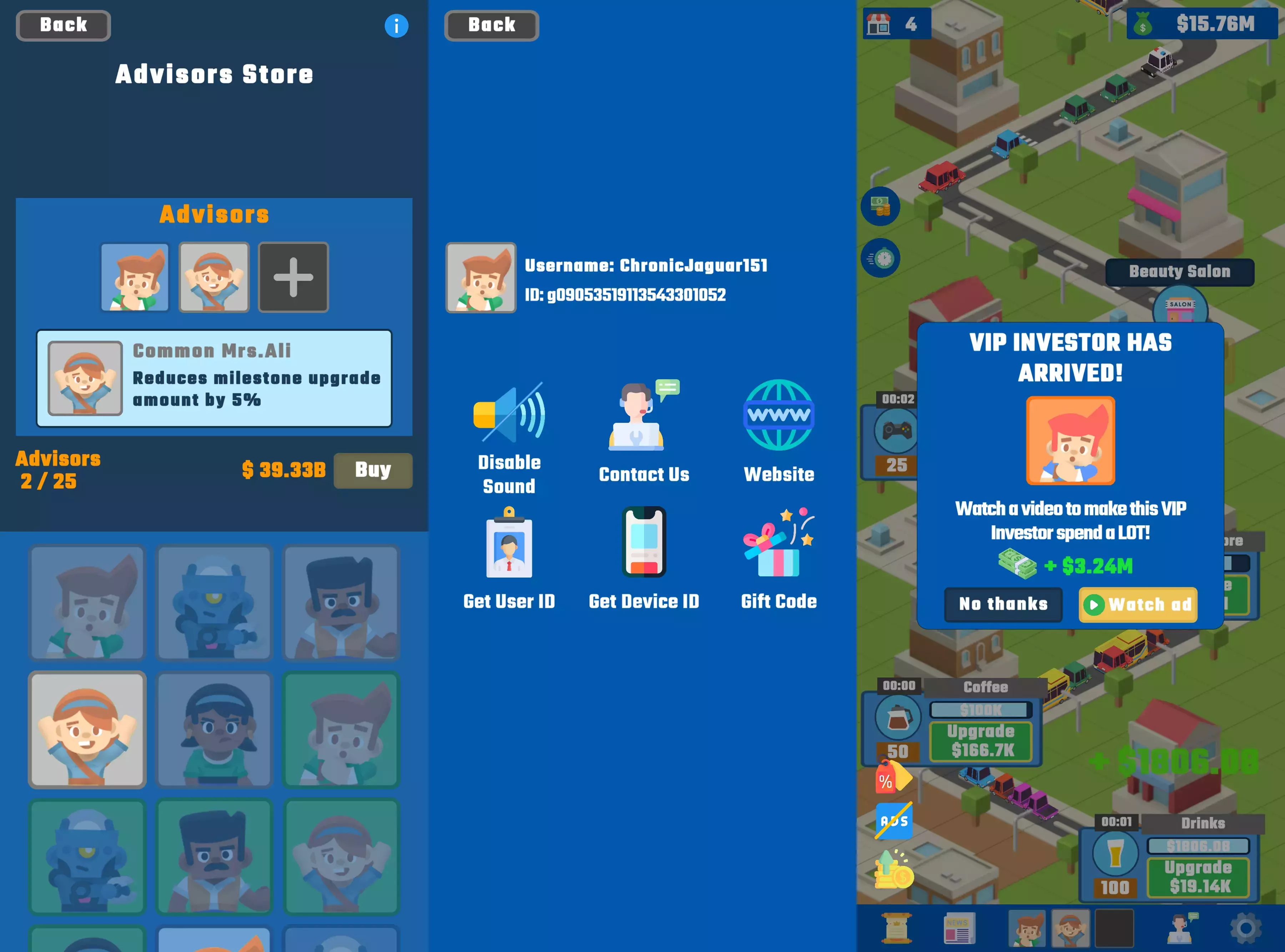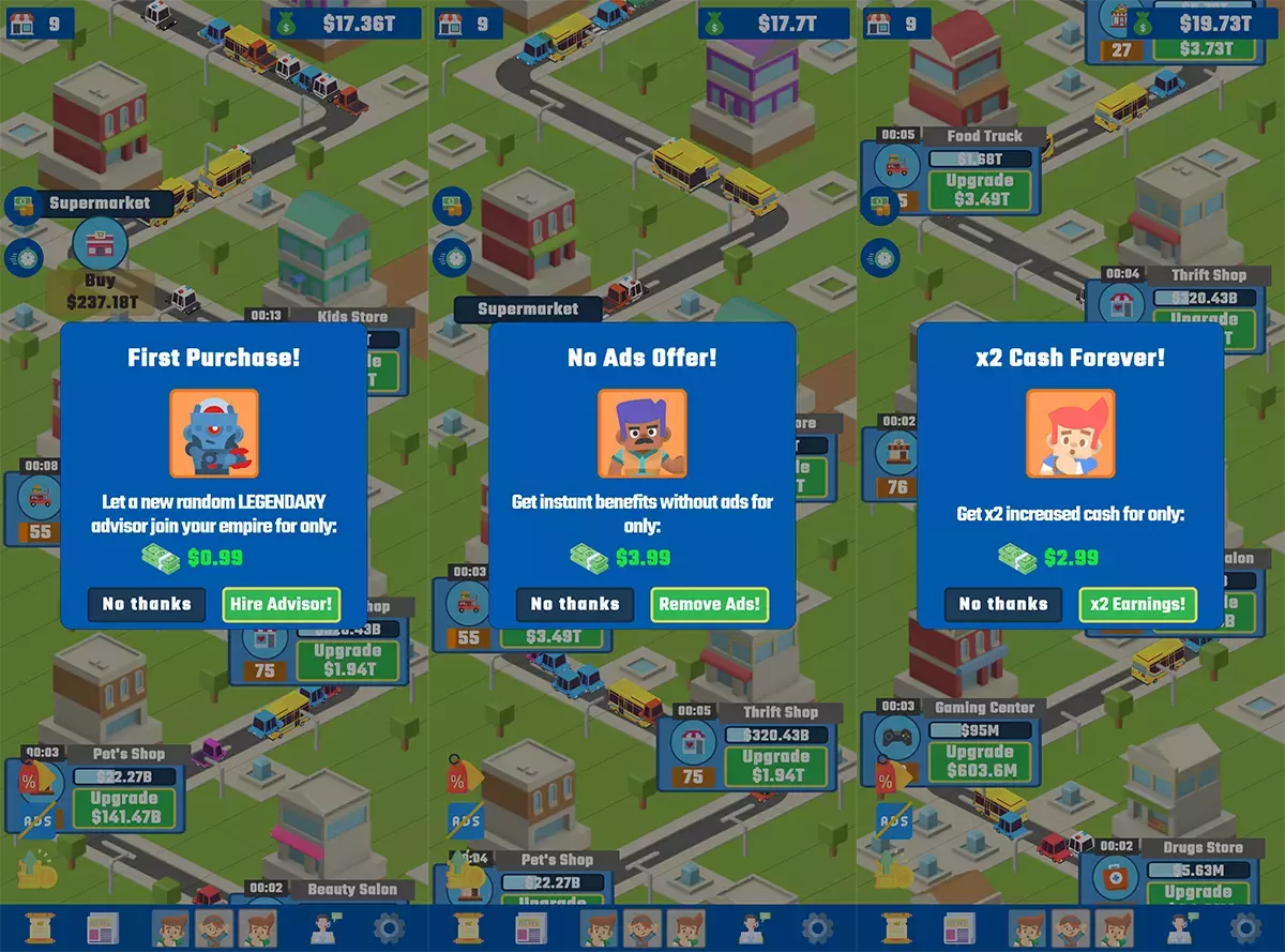 * Покупки IAP (Первая покупка, удаление рекламы, заработок в 2 раза больше, наем консультантов) *НЕОБХОДИМО АКТИВИРОВАТЬ IAP И НАСТРОИТЬ КОНФИГУРАЦИЮ И ПРОДУКТЫ В PLAY STORE.*