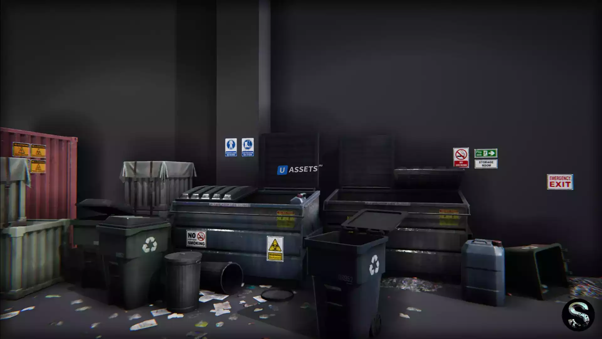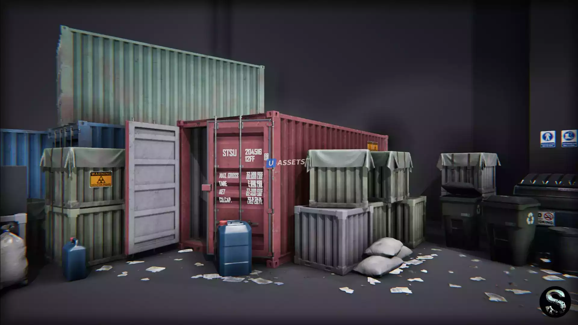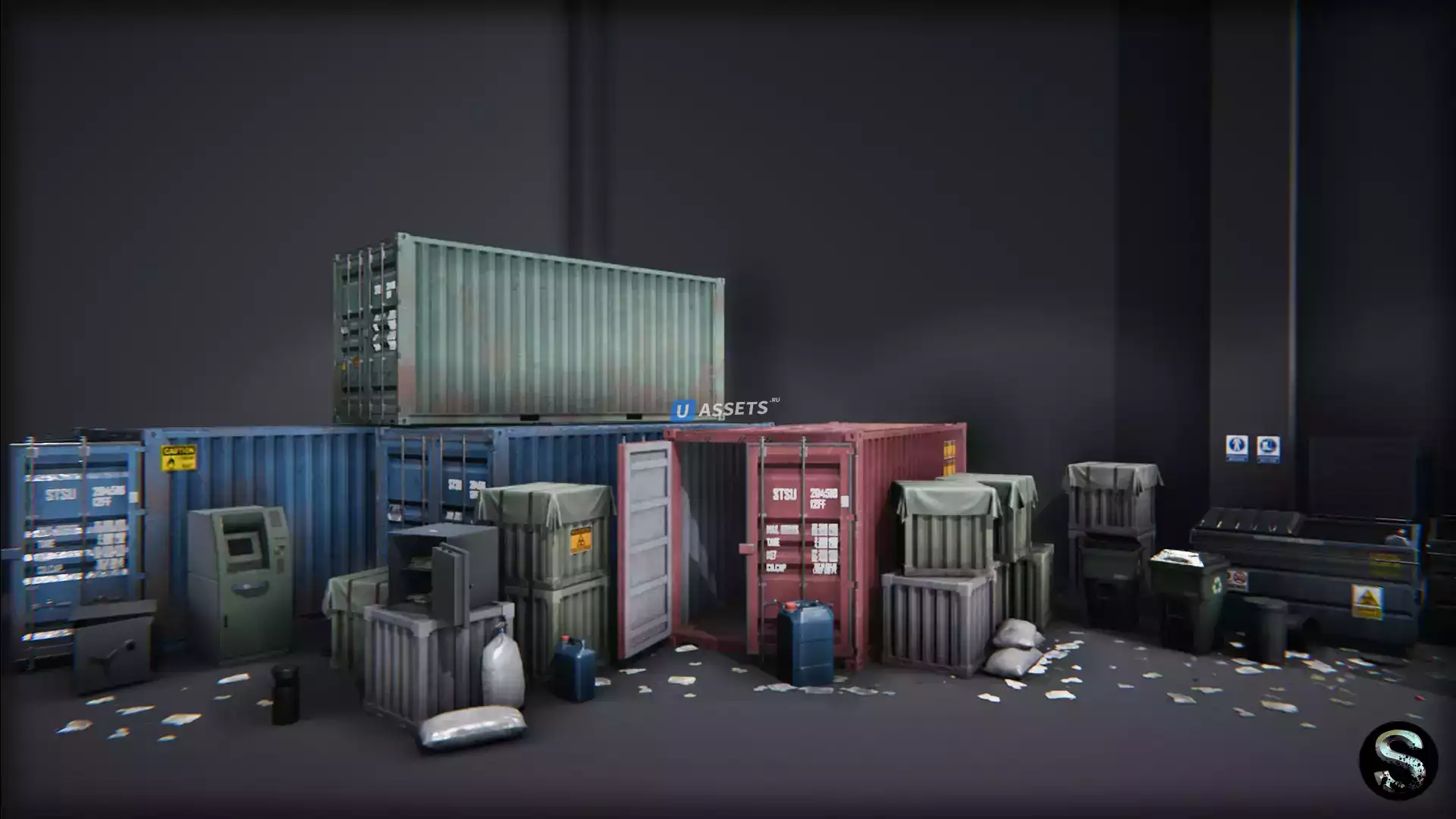 Включает в себя модели контейнеров, ящиков, мешков, множество различных вывесок, мусора.