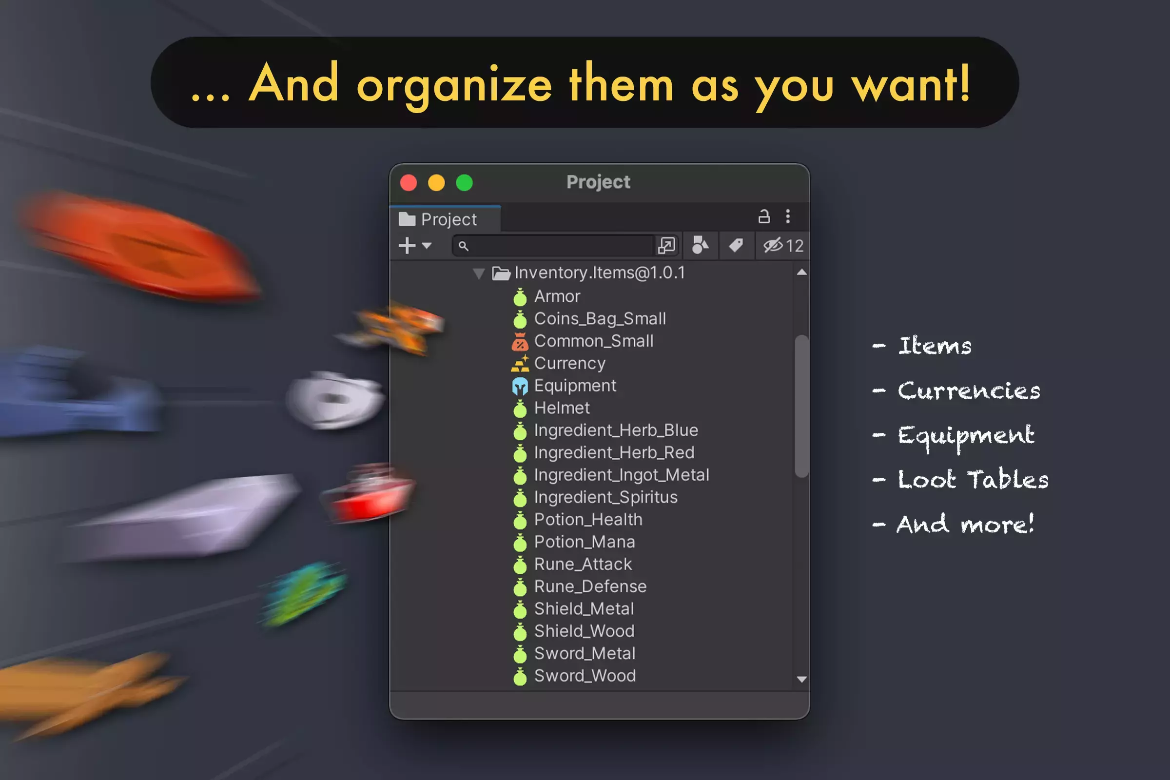 Их можно легко назначить на Bag - компонент, который хранит предметы и может быть прикреплен к любому игровому объекту.