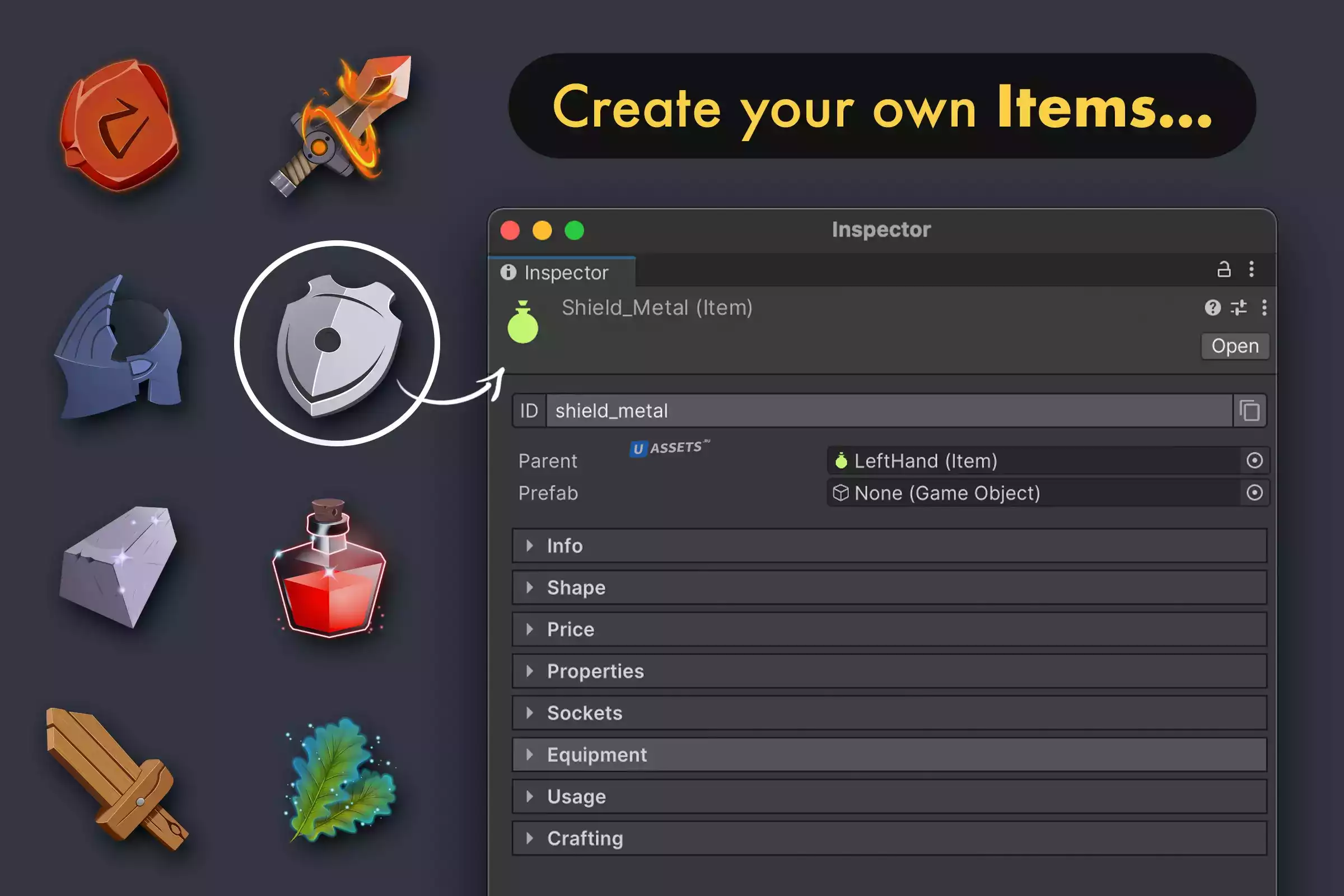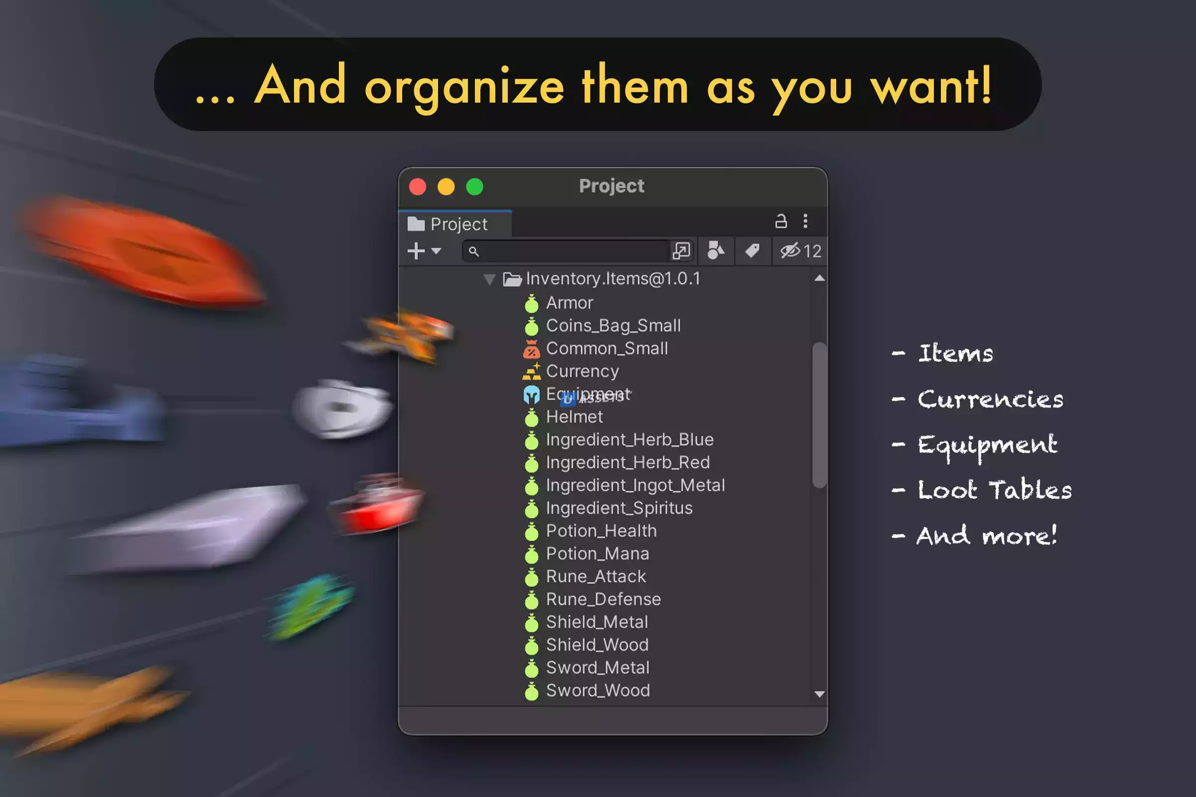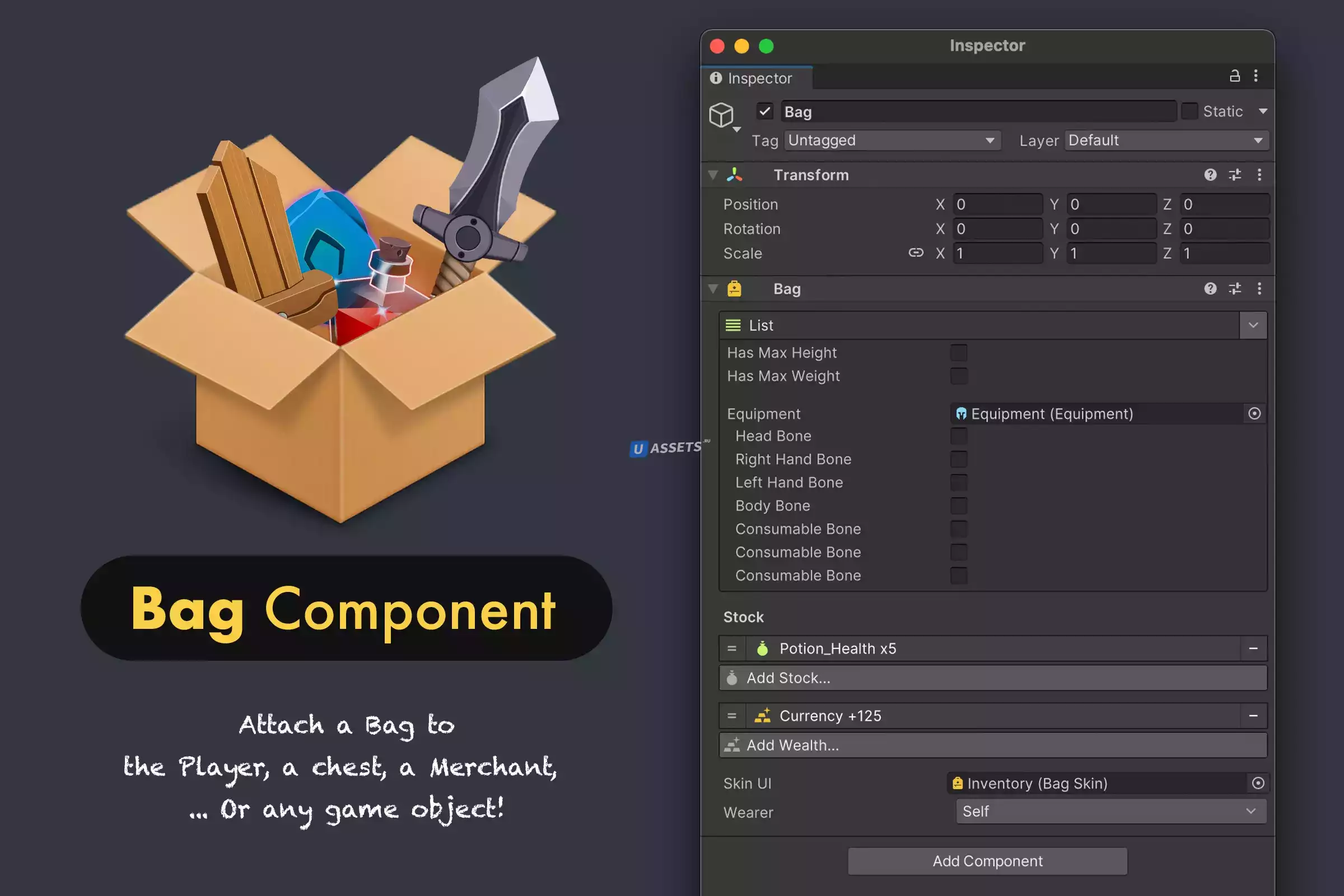 Их можно легко прикрепить к сумке, которая является компонентом для хранения предметов и может быть прикреплена к любому игровому объекту.