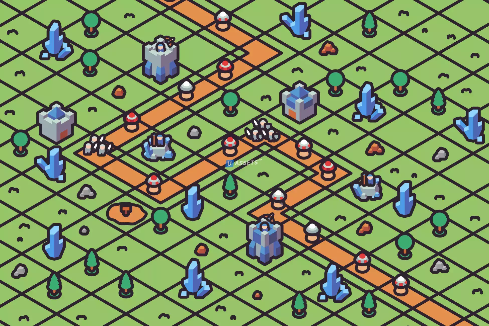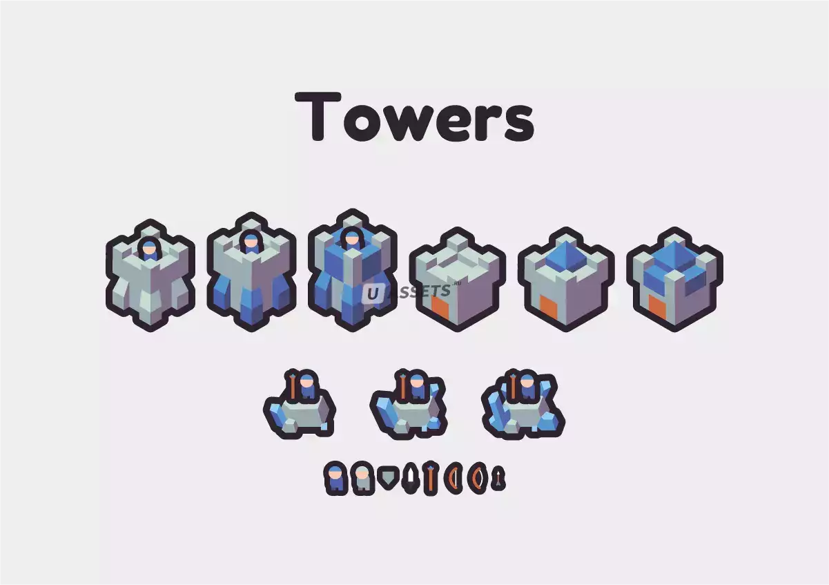 Набор Isometric Tower Defense, содержащий изометрические плитки, которые вы можете использовать в своих частных или коммерческих изометрических играх или печатных проектах, например, в качестве иллюстраций к картам!