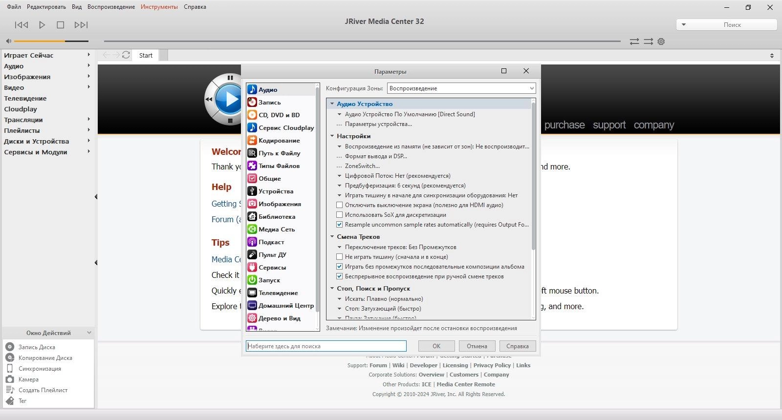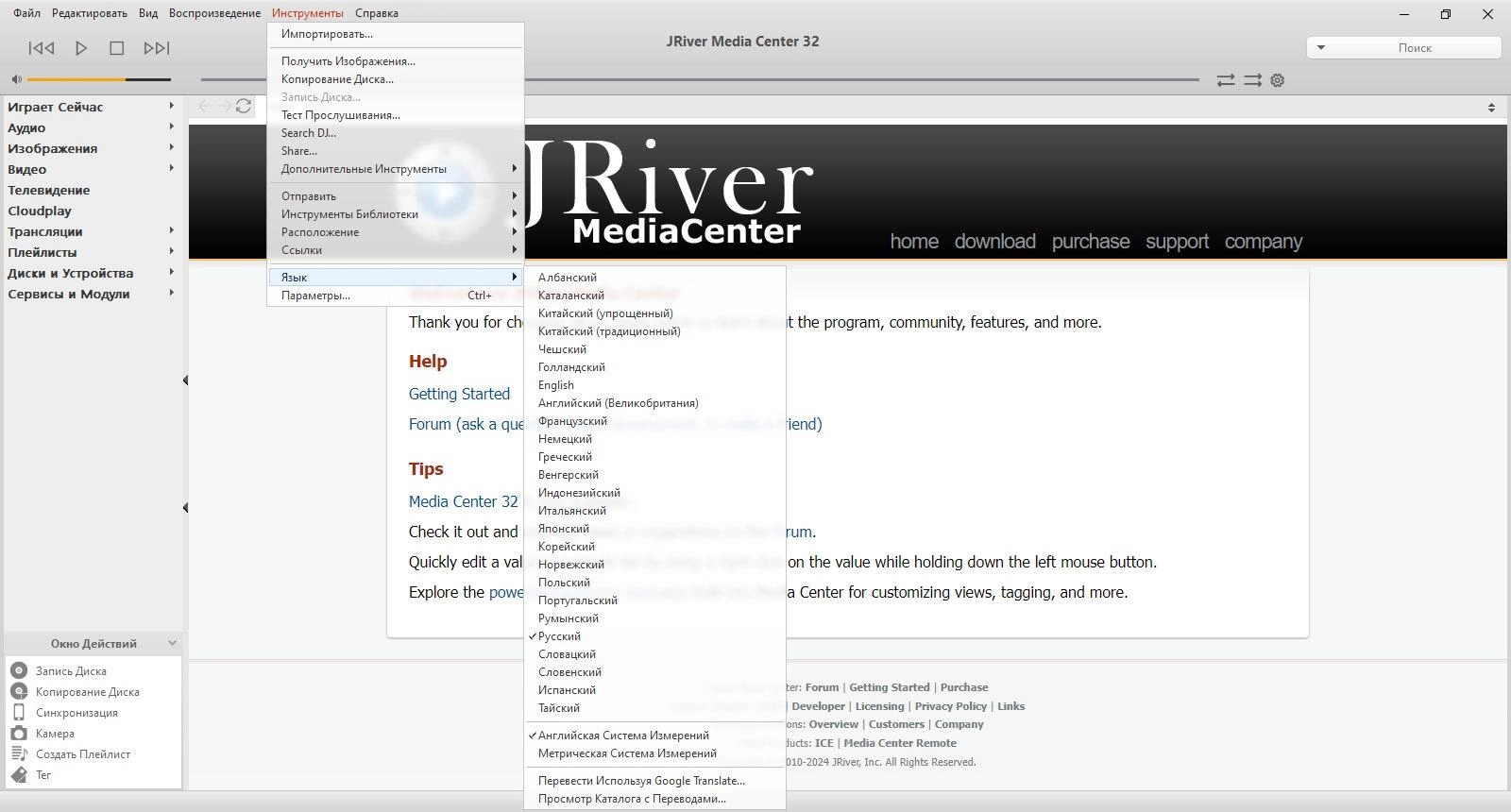 Основные возможности JRiver Media Center включают воспроизведение большинства популярных аудио- и видеоформатов, таких как MP3, аудио-CD и DVD. Софт позволяет конвертировать аудио с компакт-дисков в форматы WAV и MP3, а также оцифровывать записи с виниловых пластинок и кассет, эффективно удаляя шумы и помехи. Кроме того, программа поддерживает создание собственных аудио-CD с множеством настраиваемых параметров.