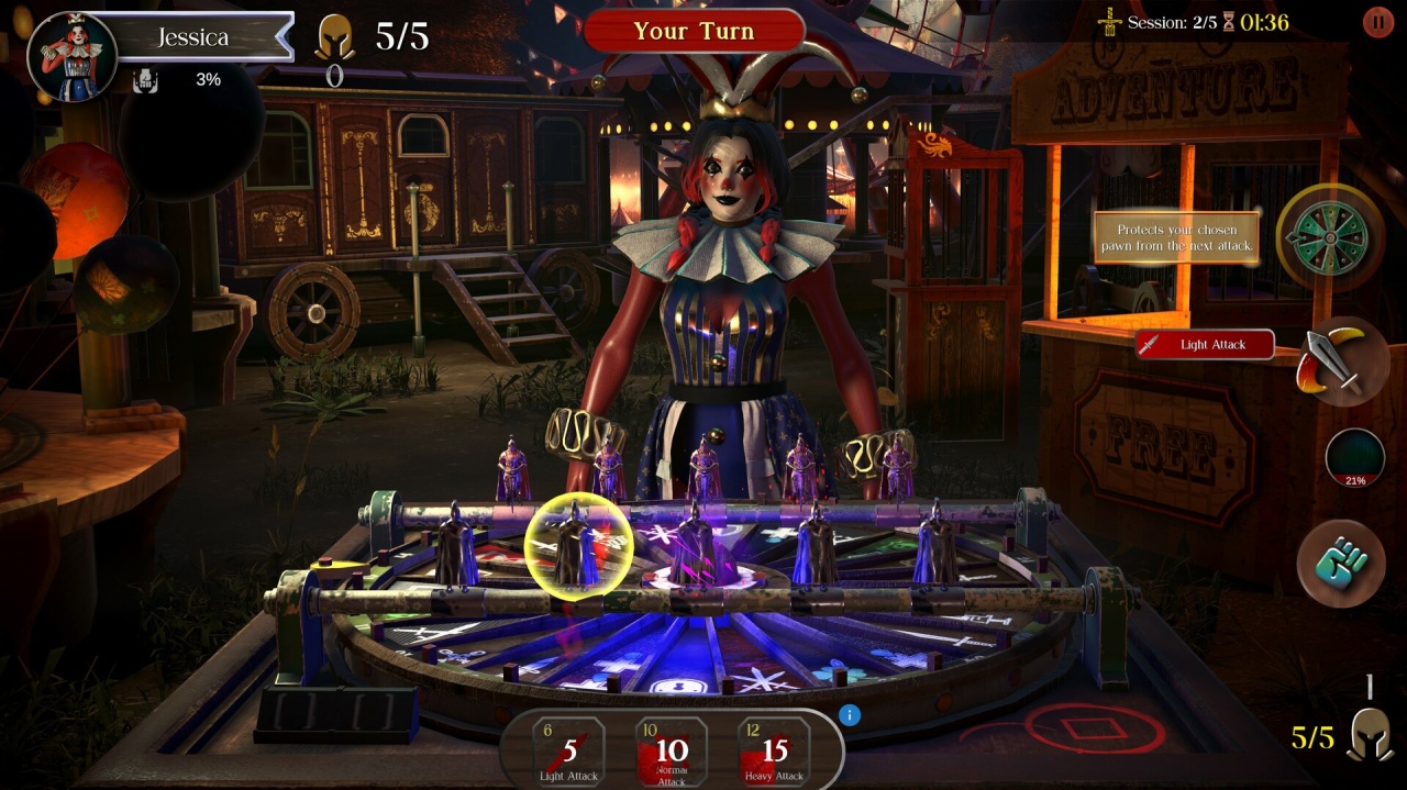 Каждый раунд начинается с вращения специального диска, указывающего на доступное действие: атаку, использование предмета или уникальный специальный прием, способный кардинально изменить расстановку сил. После этого игрок управляет своим отрядом в пошаговой тактической схватке, тщательно выбирая цели для атаки. Как правило, каждая боевая единица атакует противника на противоположной позиции, что требует от игрока внимания к расстановке своих сил. Победа в таких столкновениях открывает доступ к новым умениям и introduces более сложных противников, постоянно поддерживая интерес к игре.