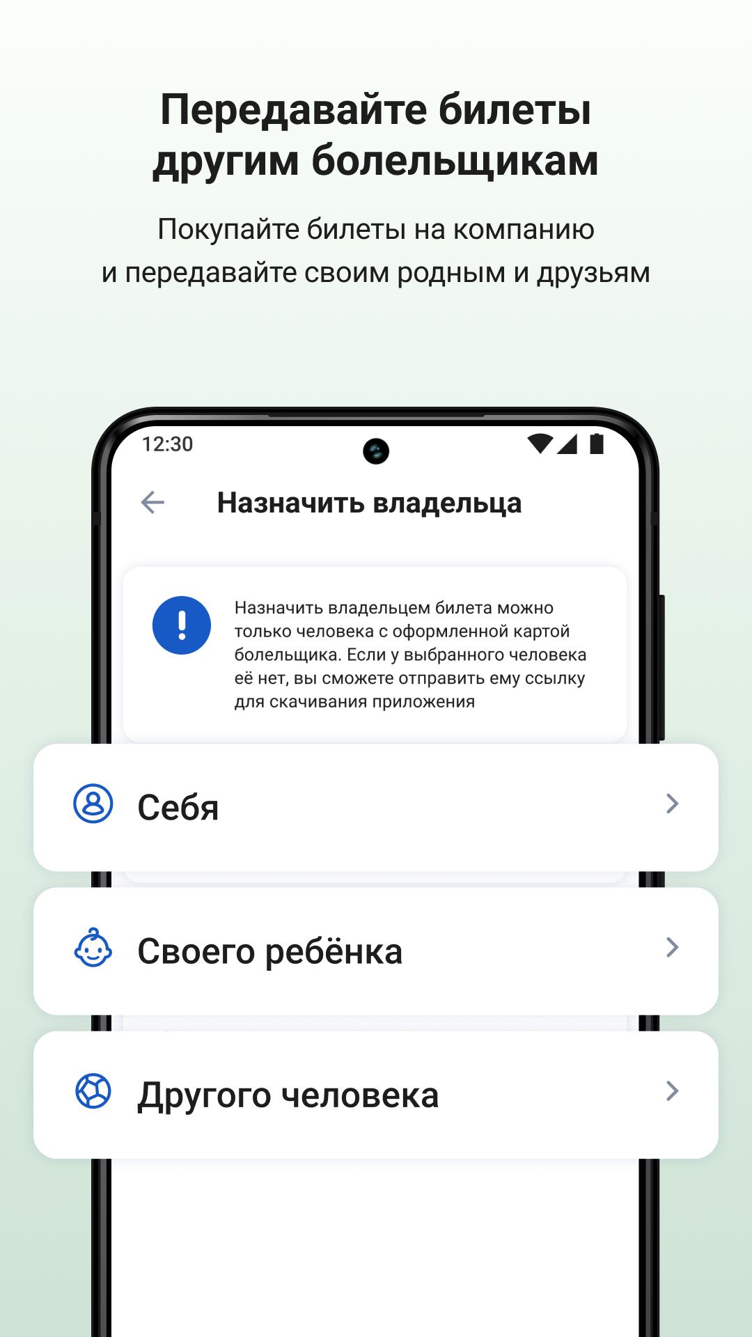 - Передача билетов: Назначайте билеты на себя или других людей, у которых уже есть «Карта болельщика». Есть возможность создавать детские билеты без отдельного места, привязанные к билету взрослого.