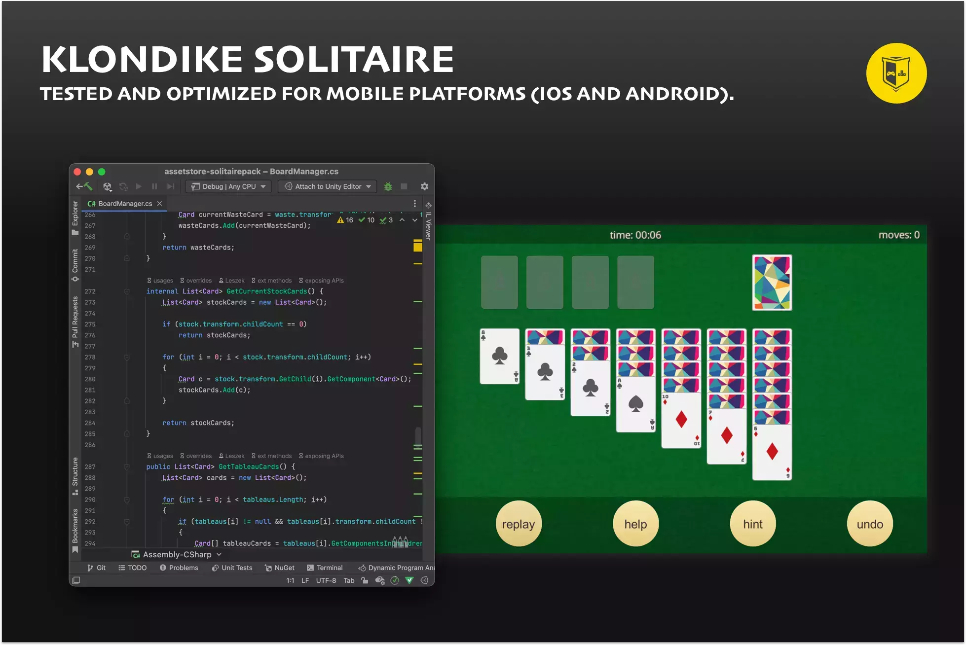 Пасьянс Клондайк - один из самых известных в мире пасьянсов. Этот проект играет в Клондайк из коробки и может быть легко настроен и использован для покера, Freecell, Spider, Pyramid, Rummy, Black Jack или любой другой игры, которую вы можете себе представить.