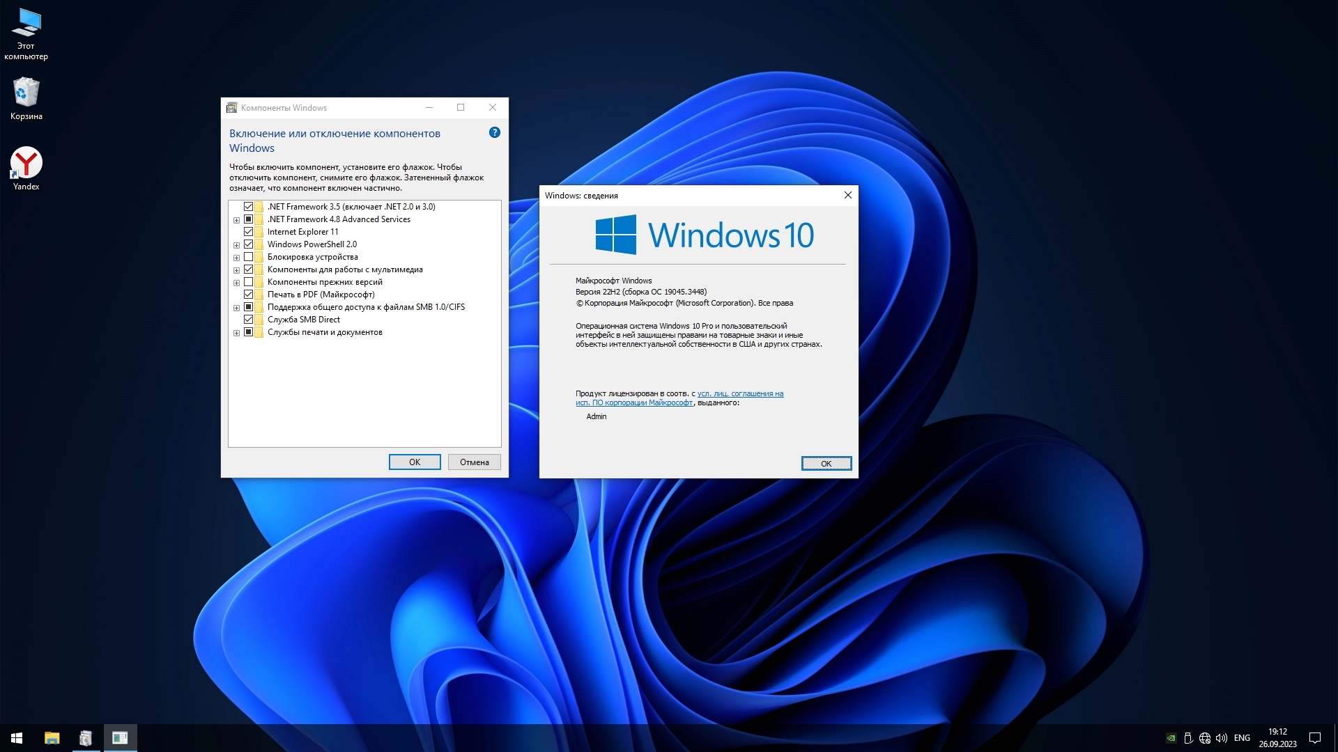 - Позволяет использовать функции: Yandex браузер, SmartScreen, Удалённый монитор и дополнительные опции изменив в файле ответов autounattend.xml.