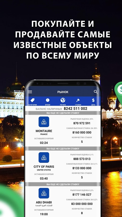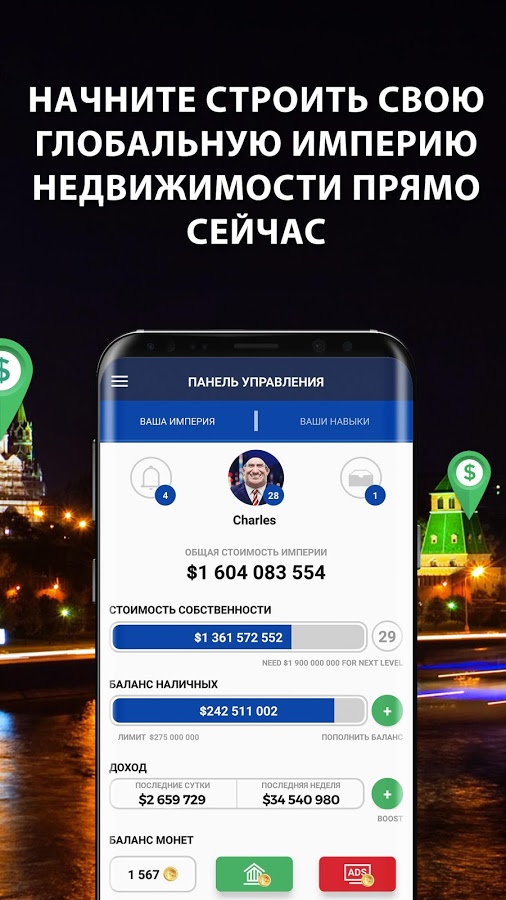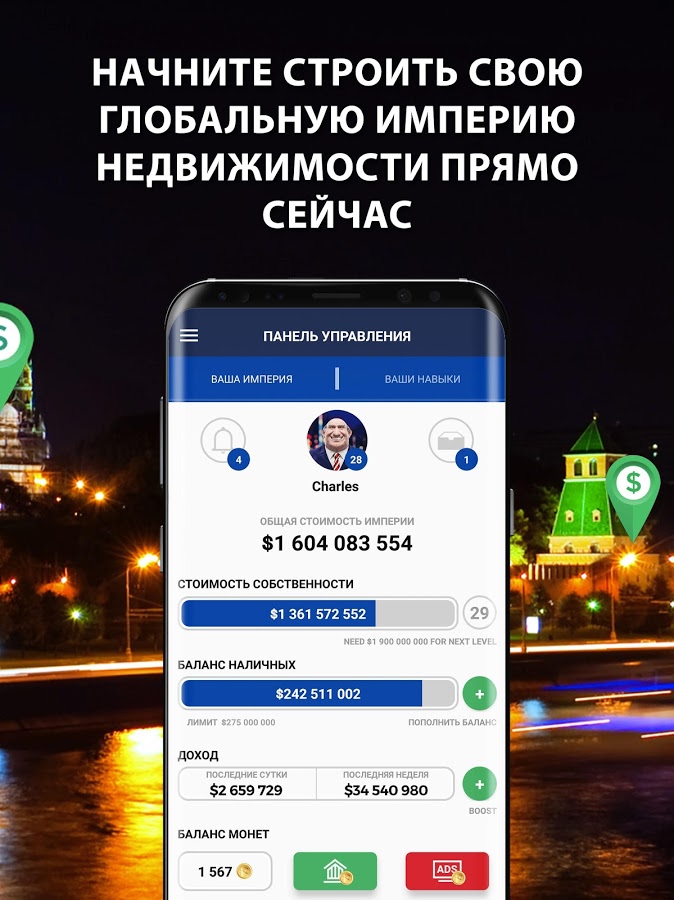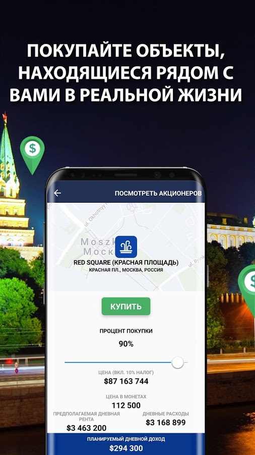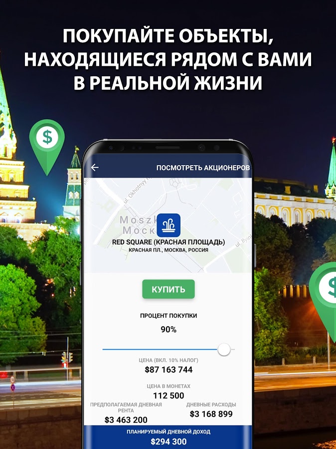 Игра предоставляет отличный стартовый капитал, позволяя сразу погрузиться в мир инвестиций. Механика получения дохода тесно связана с активностью в реальных локациях, что делает процесс еще более увлекательным. Обновляйте свои объекты, чтобы увеличивать их стоимость и доходность.