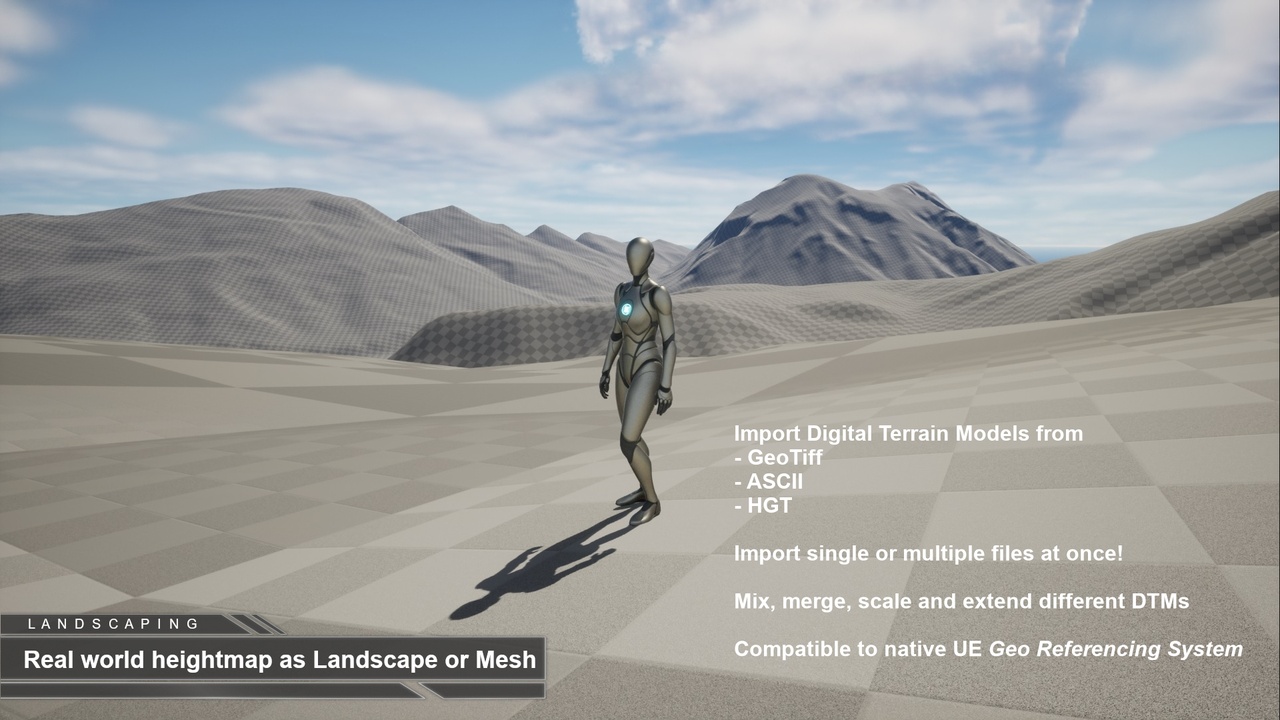 Landscaping предоставляет удобный способ импорта GIS-данных в Unreal Engine как единый ландшафт или с использованием более сложных методов создания миров, таких как World Composition (UE4), World Partition (UE5) или Procedural/Static Mesh. Эта гибкость позволяет разработчикам интегрировать сложные географические данные в виртуальные миры. Поддержка различных форматов файлов, включая GeoTiff, ASCII, HGT и GeoPackage, позволяет легко импортировать Цифровые Модели Рельефа (DTM) с высокой точностью.