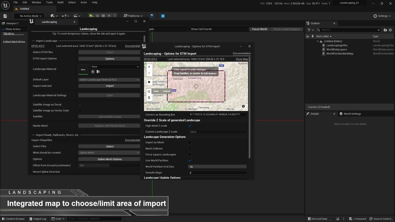 С возможностью импорта и визуализации GIS-данных напрямую в Unreal Engine, разработчики могут создавать более реалистичные и основанные на данных ландшафты. Независимо от того, работаете ли вы с большими мирами с использованием World Partition в UE5 или управляете меньшими, модульными ландшафтами с помощью World Composition в UE4, инструменты Landscaping обеспечивают эффективное управление данными рельефа. Плагин также поддерживает Procedural/Static Meshes для дополнительной настройки, что позволяет гибко генерировать и оптимизировать ландшафт.