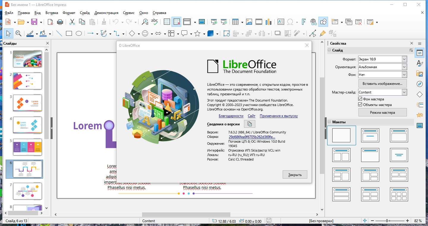 LibreOffice 7.6.3.2 Final — это мощный офисный пакет с открытым исходным кодом, созданный как бесплатная и полнофункциональная альтернатива коммерческим решениям. Он произошел от проекта OpenOffice.org и включает в себя все необходимые приложения для продуктивной работы: текстовый редактор Writer, табличный процессор Calc, программу для создания презентаций Impress, векторный графический редактор Draw, редактор формул Math и систему управления базами данных Base.