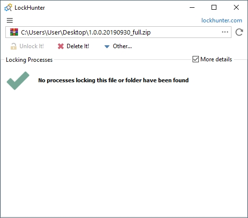 Эта небольшое и простое в использовании приложение предназначается для разблокировки «не удаляемых» файлов и папок, а также их переименования. Возможности LockHunter включают вывод сведений о блокирующих процессах, выгрузку из процессов библиотек, пакетное удаление файлов, а также интеграцию в контекстное меню Проводника. Чтобы удалить заблокированный файл, просто перетащите его на рабочее окно утилиты. При этом появится зеленая галочка, указывающая на готовность файла к удалению или переименованию.