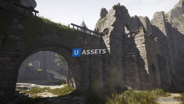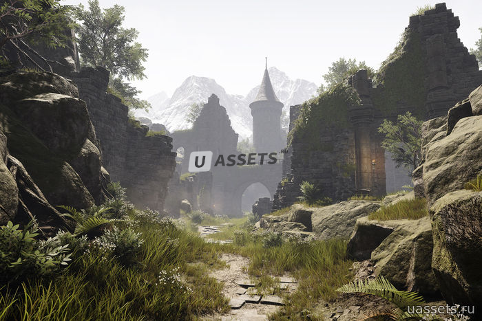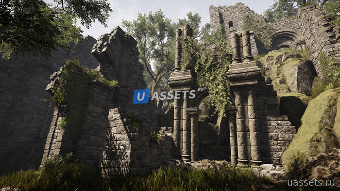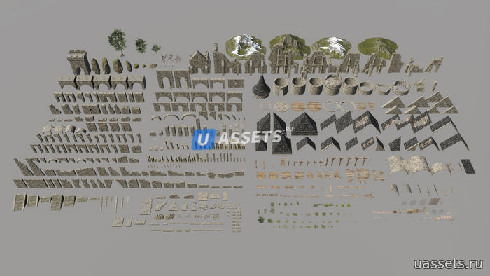Комплект, оснащенный природными ресурсами, такими как скалы, горы и растительность, позволяет создавать большие природные сцены, а также сложные здания и руины.