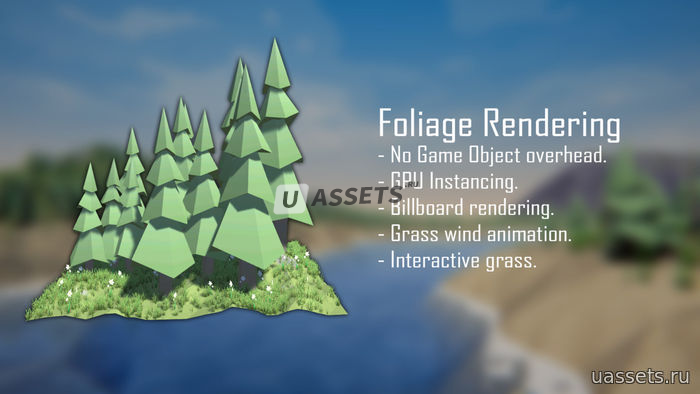• Рендеринг массивной листвы: Густой лес, визуализируемый в мгновение ока с помощью графического процессора, без накладных игровых объектов, рендеринг рекламных щитов и анимация ветра травы, а также интерактивная трава.