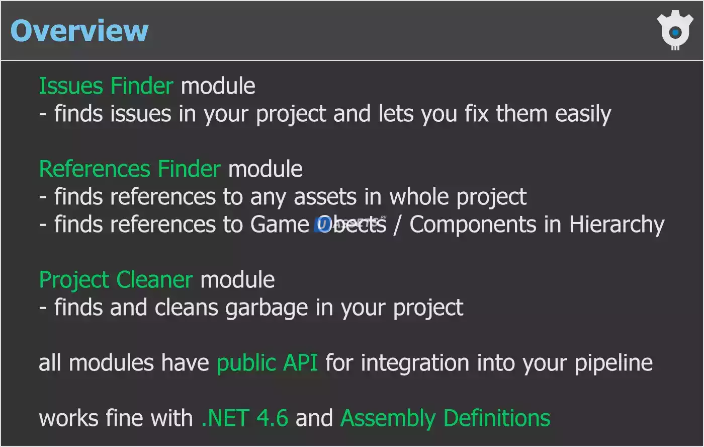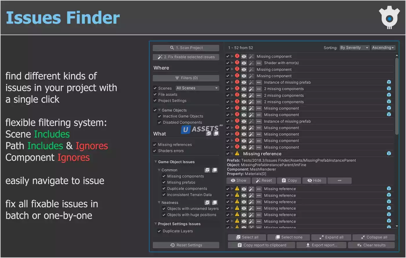 Ищет в вашем проекте различные проблемы, такие как отсутствующие сценарии, отсутствующие ссылки, повторяющиеся компоненты, недопустимые слои и многое другое. Позволяет избавиться от некоторых найденных проблем с автоматическим исправлением.