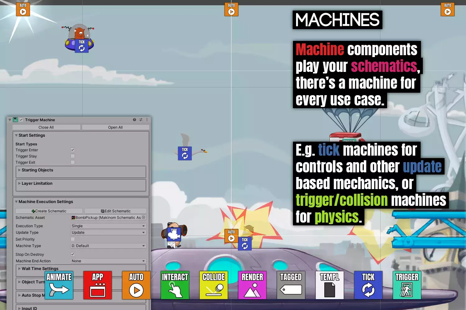 Компоненты машин используются для воспроизведения ваших схем (но схемы также могут воспроизводить другие схемы). Для каждого случая использования существует своя машина, например, Tick Machines обрабатывает функции, основанные на обновлении, такие как управление игроком/камерой, Trigger Machines может запускаться, когда объект входит в область, или Collision Machines, когда пуля попадает в цель.