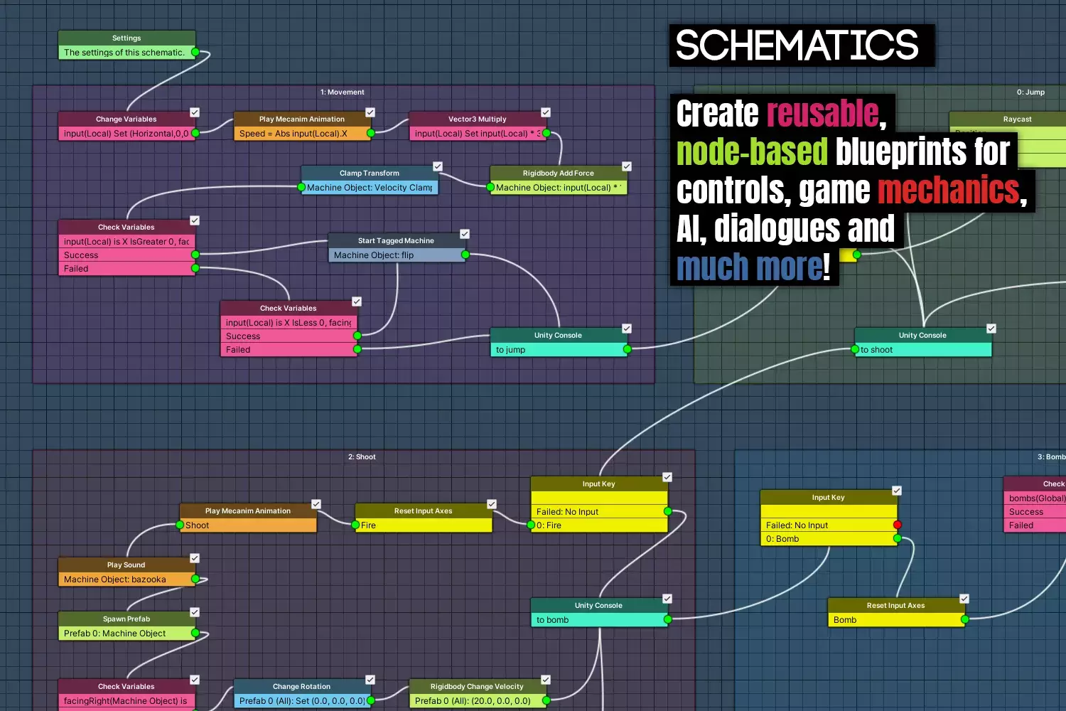 Создавайте многократно используемые чертежи того, что вы хотите сделать, на основе узлов. Схемы работают подобно блок-схемам: каждый узел выполняет задачу и определяет следующий узел, который будет выполнен. Доступно более 400 узлов, начиная с таких простых вещей, как воспроизведение аудиоклипа, порождение префаба или увеличение счетчика, и заканчивая сложными операциями, такими как перемещение/вращение во времени или переход в новое положение камеры.