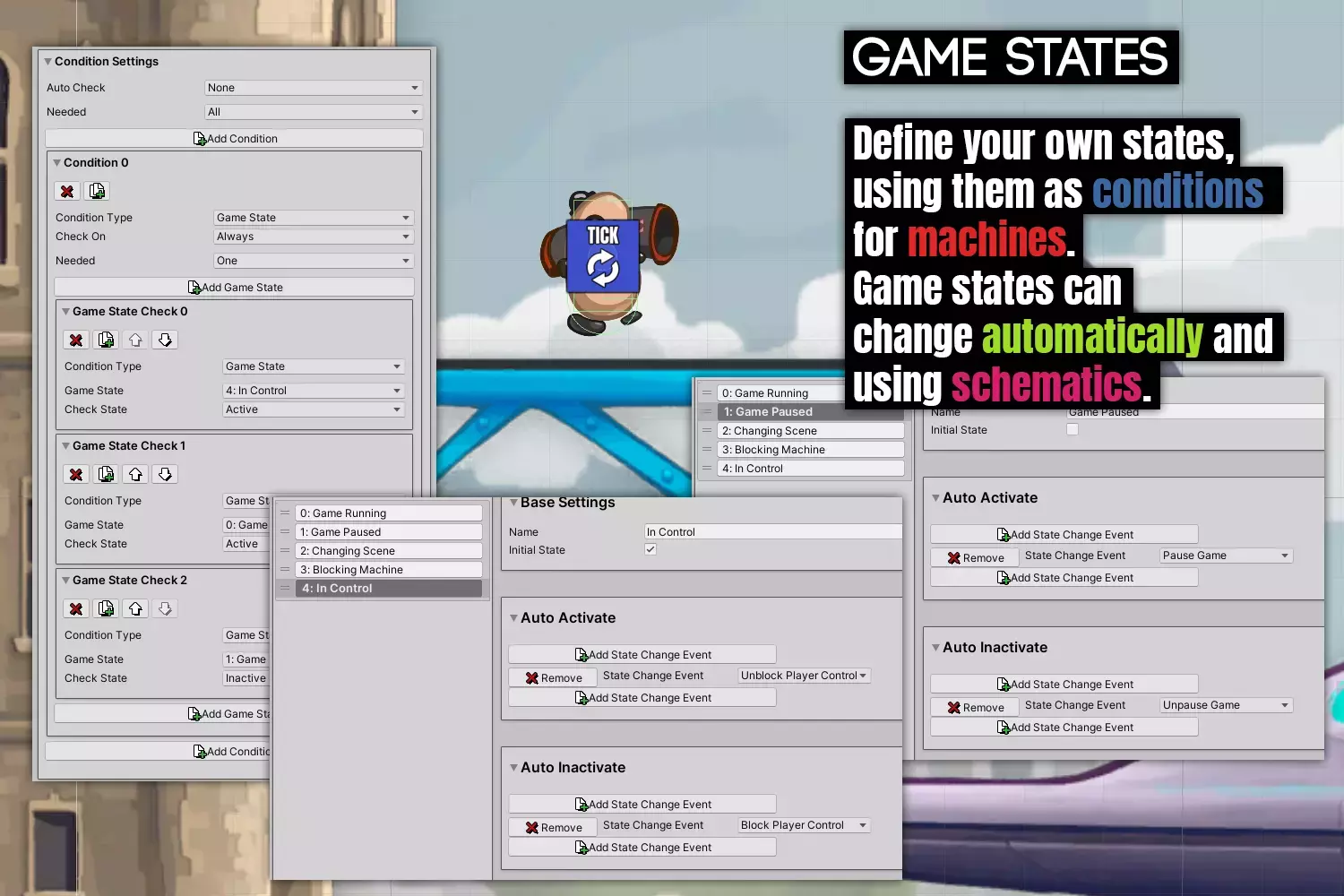 Состояния игры (автоматическое и ручное изменение состояния и как условия для машин)