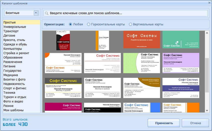 Более 570 готовых шаблонов визиток по самым разным темам.