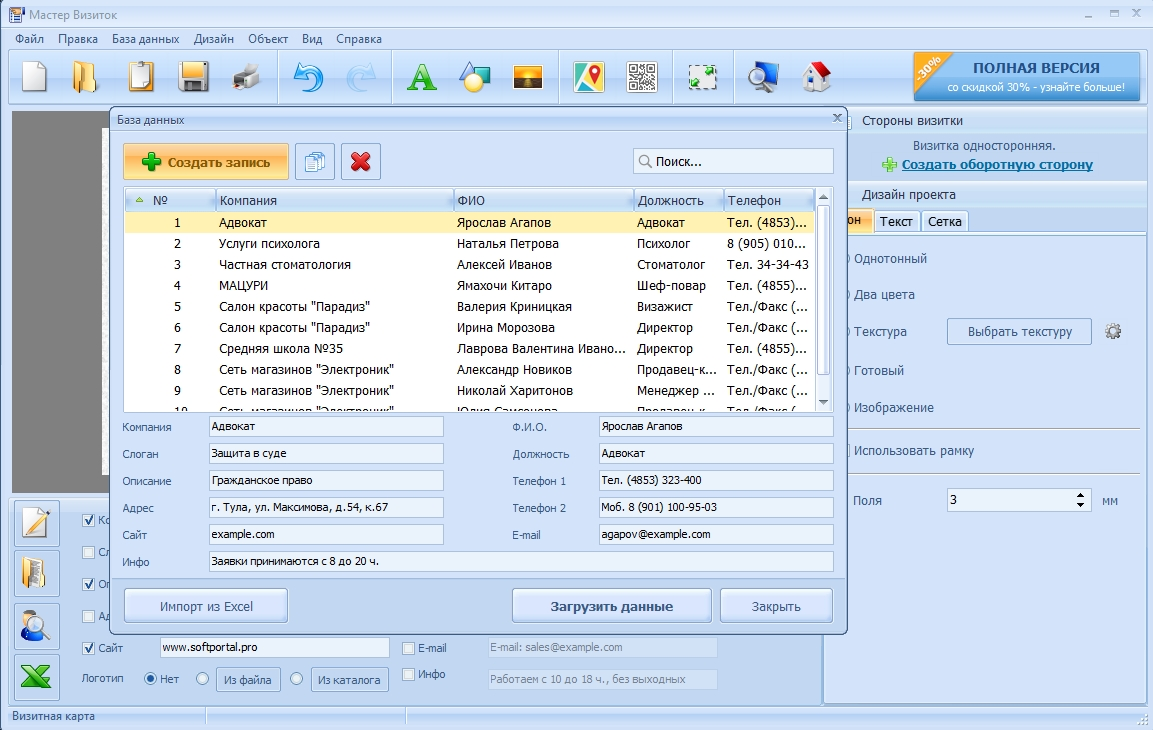Кроме этого программа позволяет создавать базу данных компаний, и вносить оттуда данные, название компании, номер телефона, сайт и другую информацию одним кликом, просто выбрав из списка, это очень удобно и экономит время.