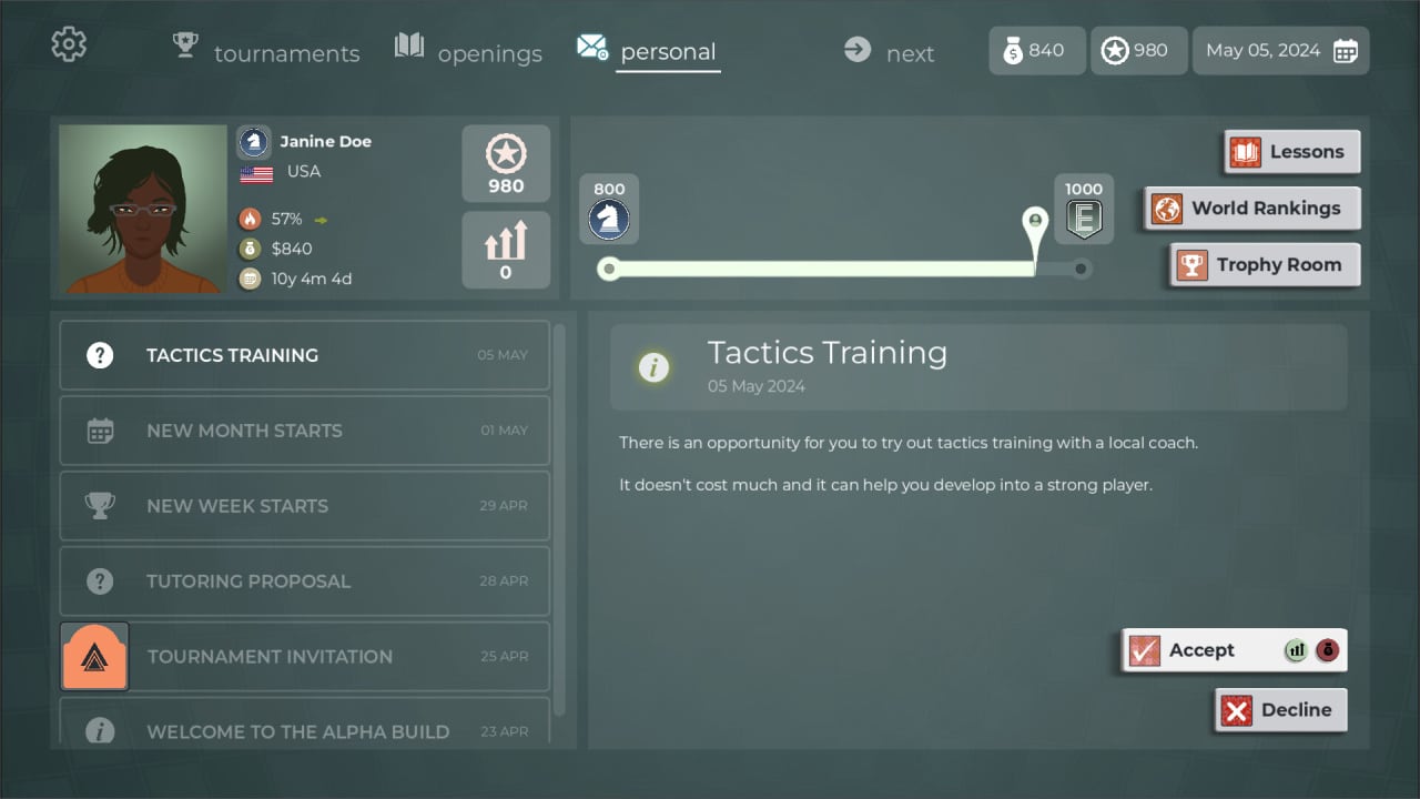 Вы начнёте как подающий надежды игрок с амбициозными целями. Ваша задача — пройти путь на самый верх и завоевать титул признанного мастера. Игра предлагает реалистичные и сложные поединки, требующие глубокой стратегии и умения просчитывать ходы наперёд. Вам не придётся разбираться во всём самостоятельно: встроенный ИИ-тренер поможет освоить тонкости игры, подскажет эффективные дебюты и научит побеждать в решающих эндшпилях.