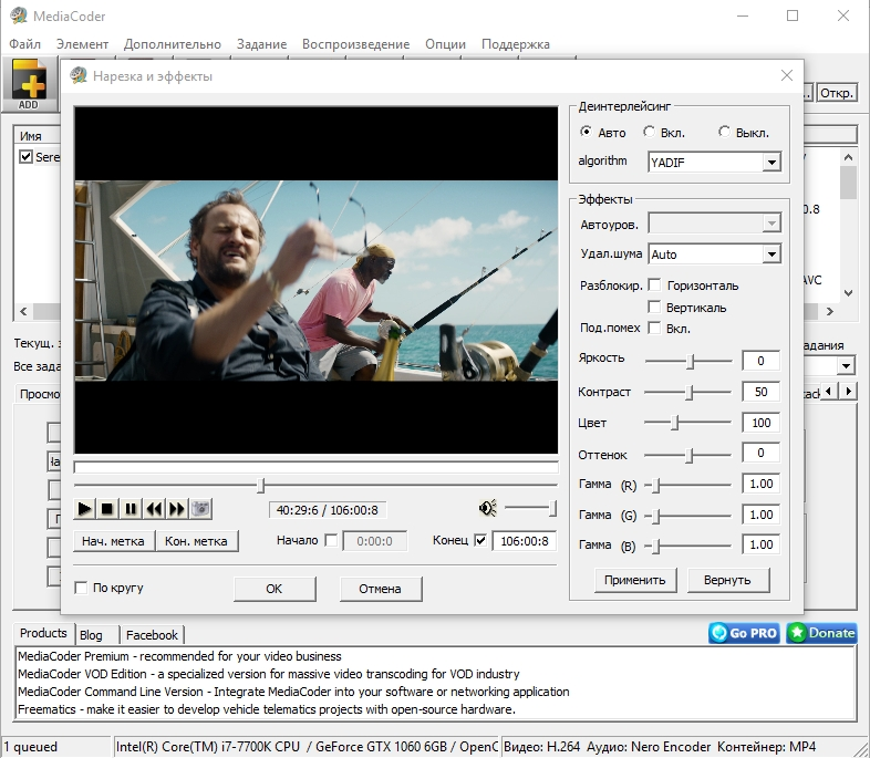 Процесс работы с программой сводится к простому алгоритму: выбрать файл или несколько файлов для конвертирования, указать формат выходного файла, указать, при необходимости, дополнительные опции преобразования и запустить процесс конвертирования. Есть много дополнительных возможностей для каждого типа файлов. Например, если вы хотите преобразовать что-то в формате XviD, то можно включить режим высокого качества, оттенки серого, мультфильм, четверть пикселя и компенсацию движения. Помимо функций конвертации MediaCoder предоставляет возможность наложения различных эффектов и нарезки конвертированного файла.