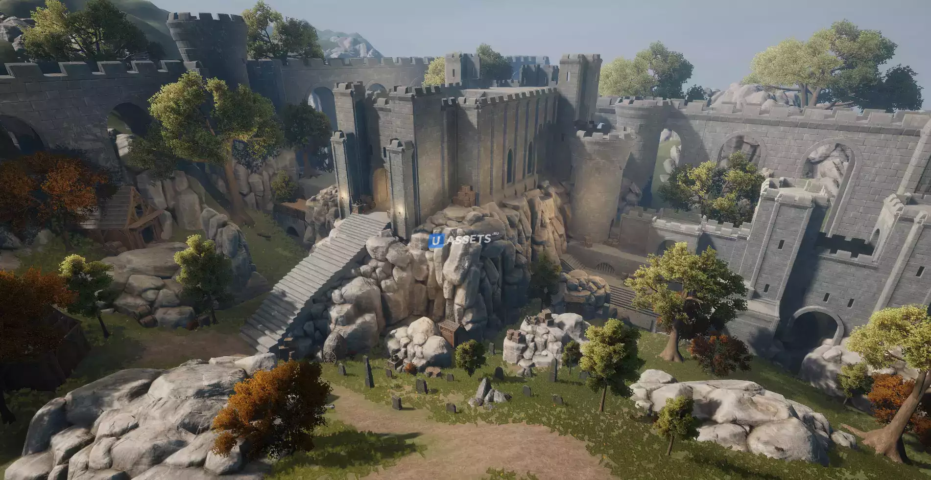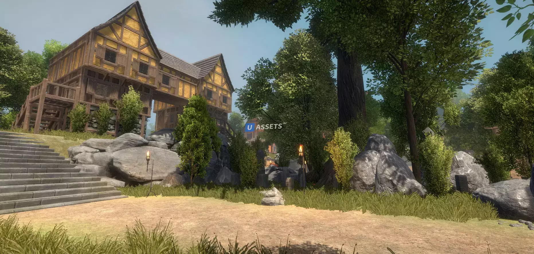 - 1 расширенная демонстрационная сцена деревенской бухты со скрытым замком в горах