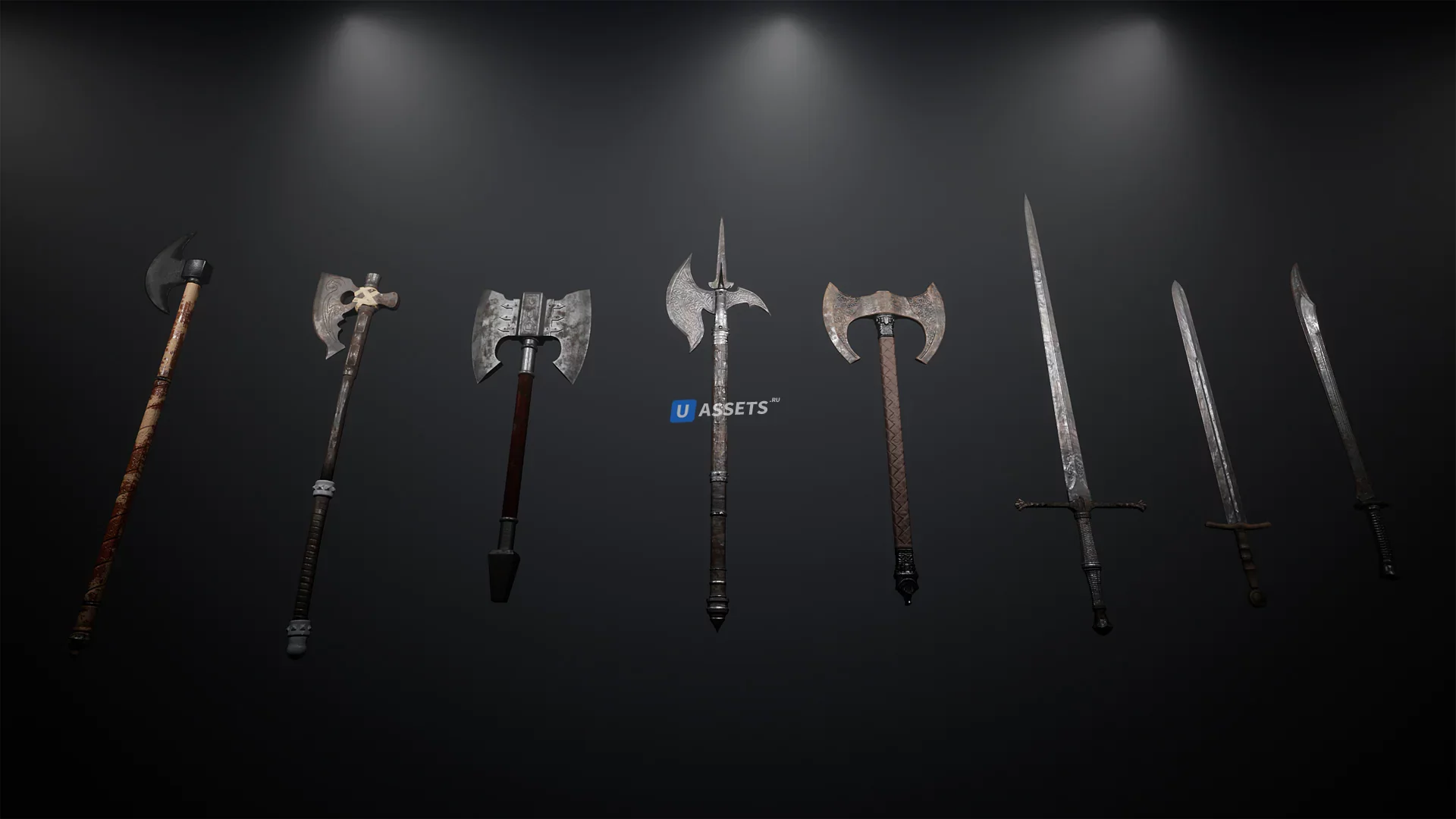 Этот Пакет содержит 8 различных видов оружия ближнего боя с текстурами PBR Каждое оружие Имеет настраиваемую карту столкновения и освещения