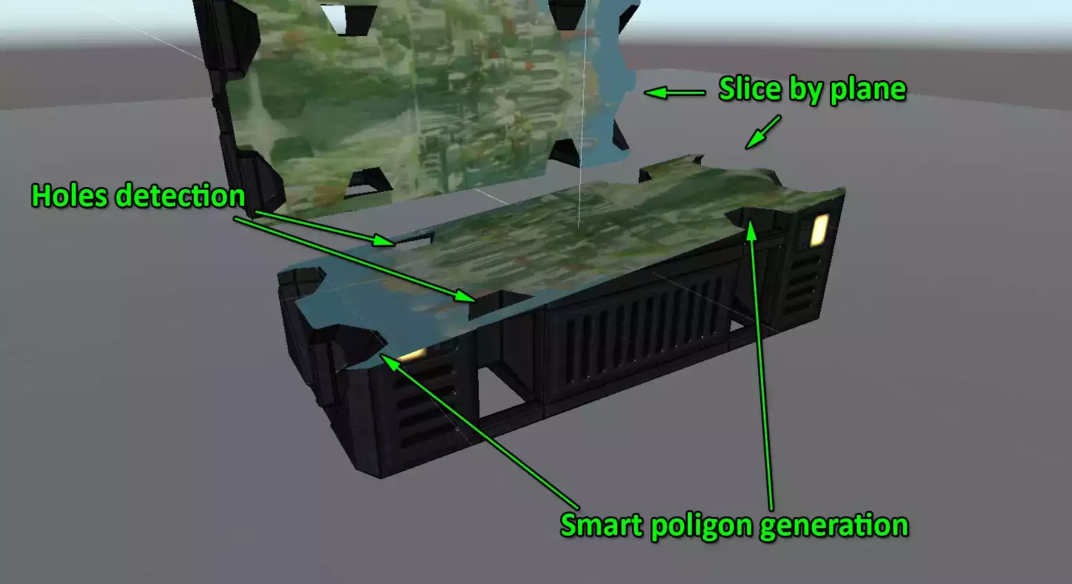 - - Вырезание сеток с помощью нескольких сеток и коллайдеров, преобразующих BoxCollider, SphereCollider и CapsuleCollider в MeshCollider;