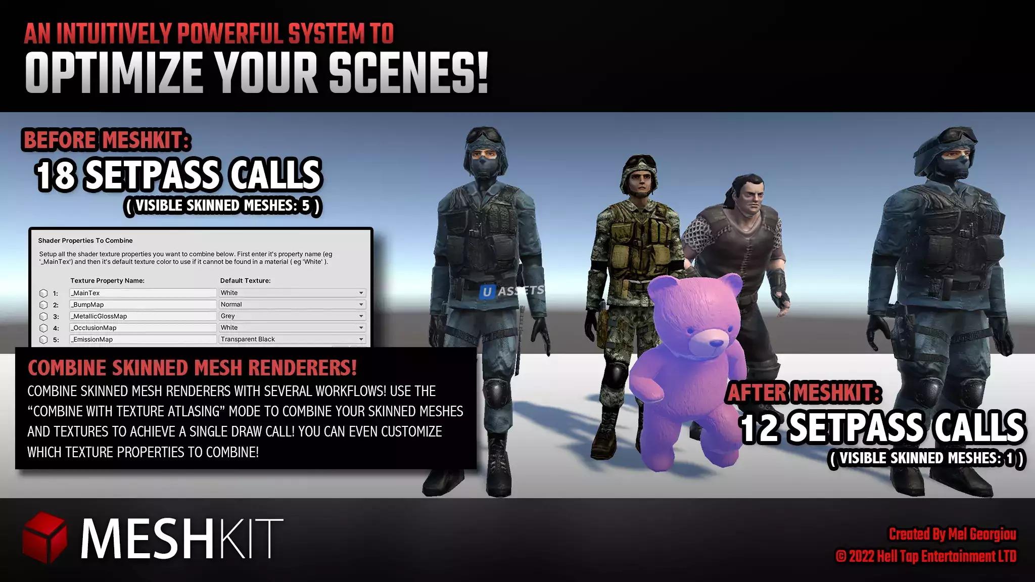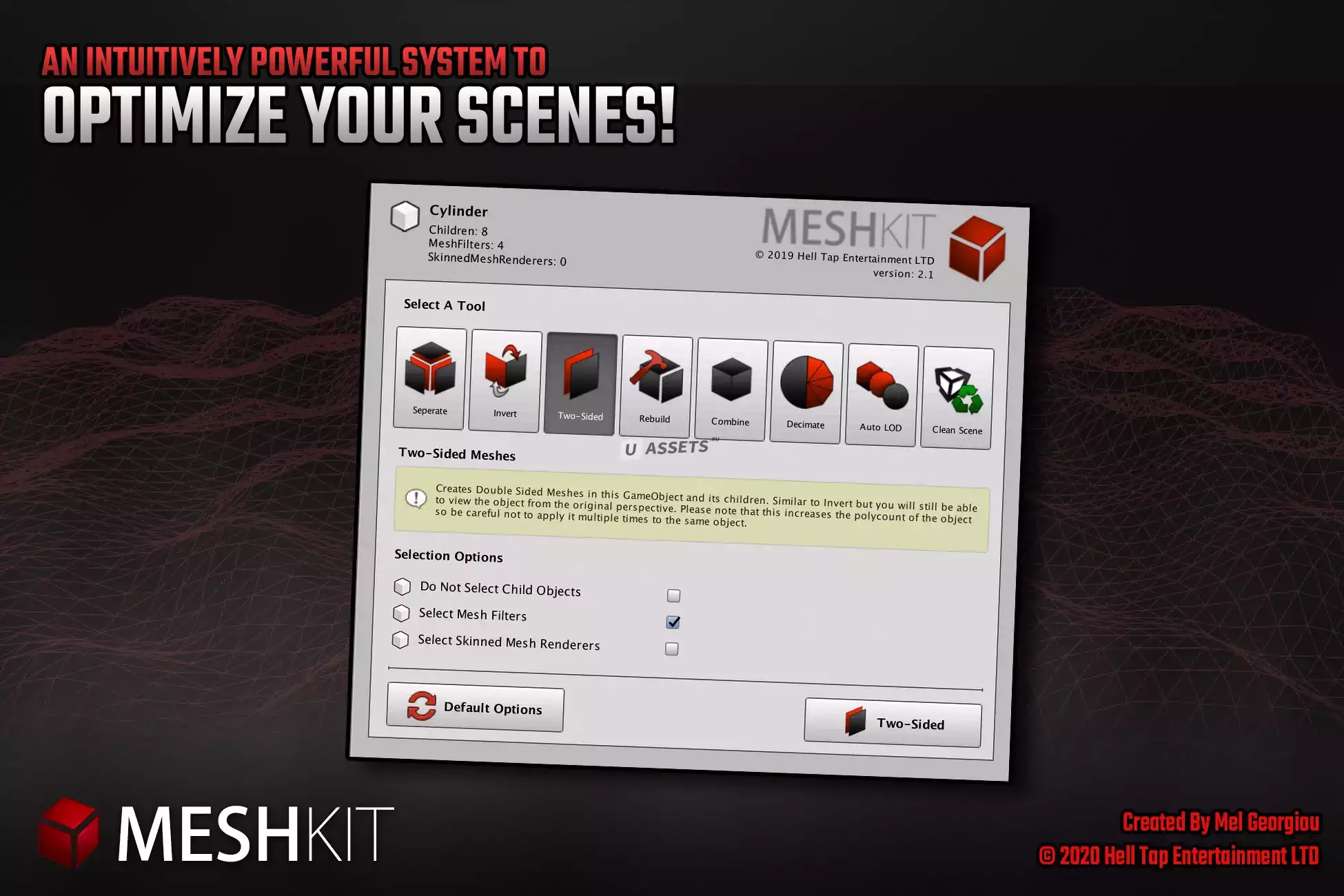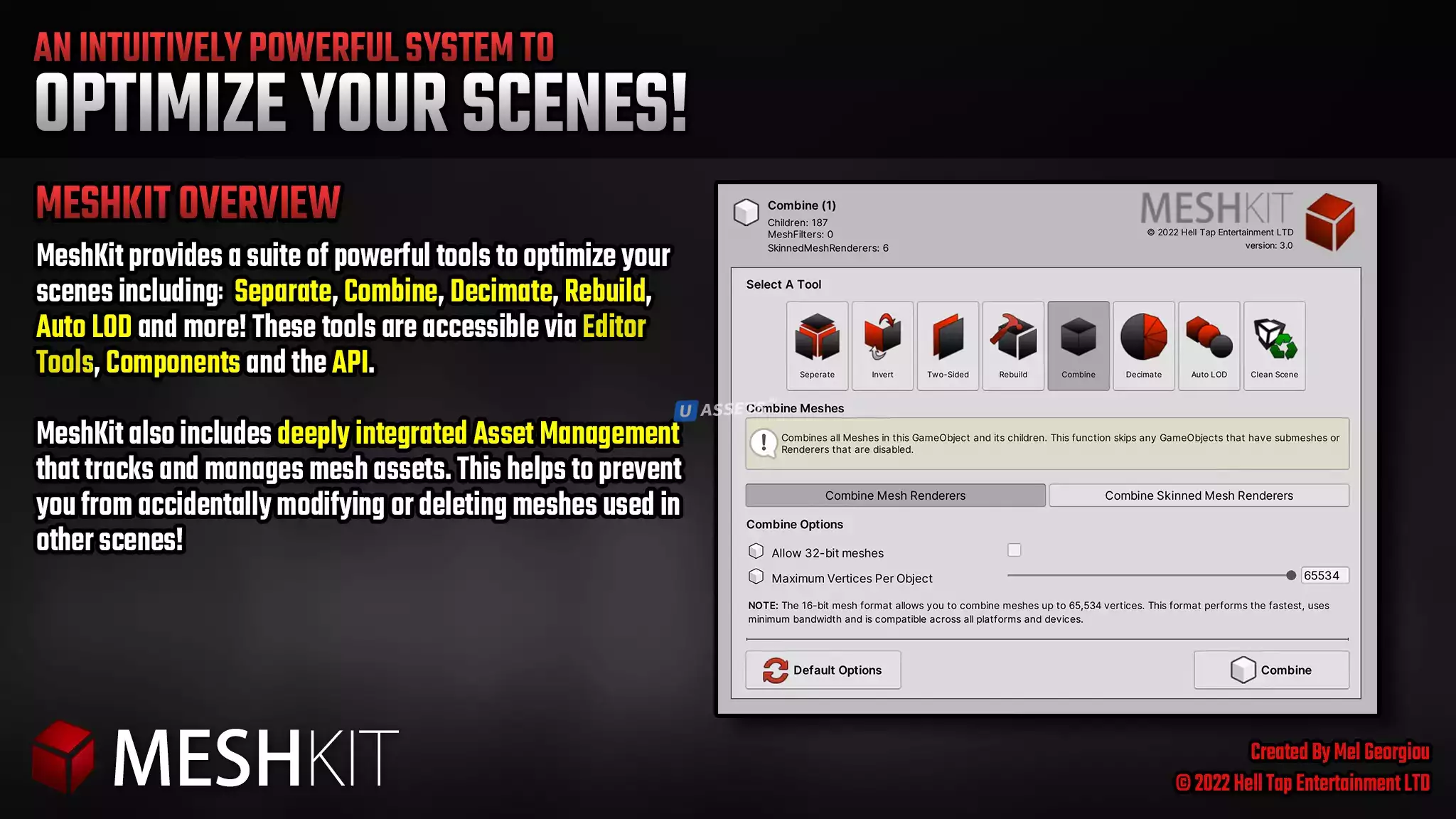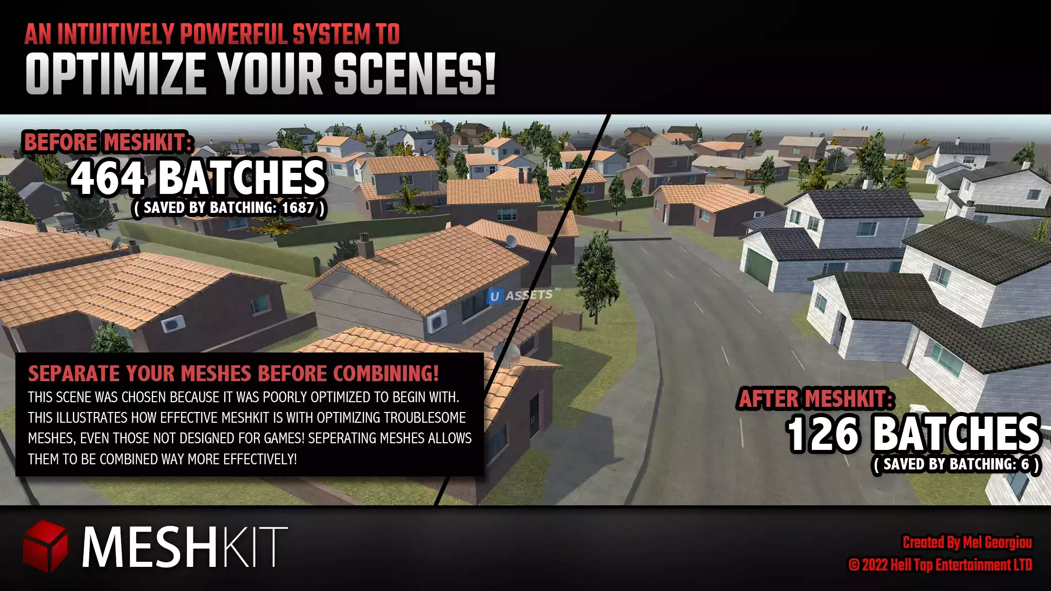 MeshKit - это интегрированный плагин для редактирования и оптимизации сеток. MeshKit включает в себя углубленную систему управления активами, которая очищает ваши неиспользуемые ресурсы и помогает защитить ваши сетки от случайного удаления - обычный сценарий для объединения сеток или использования сборных элементов с общей сеткой в разных сценах.