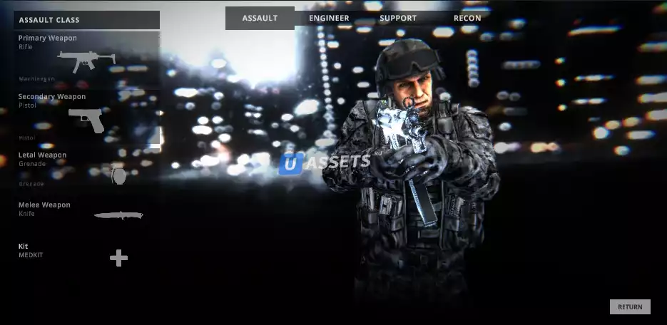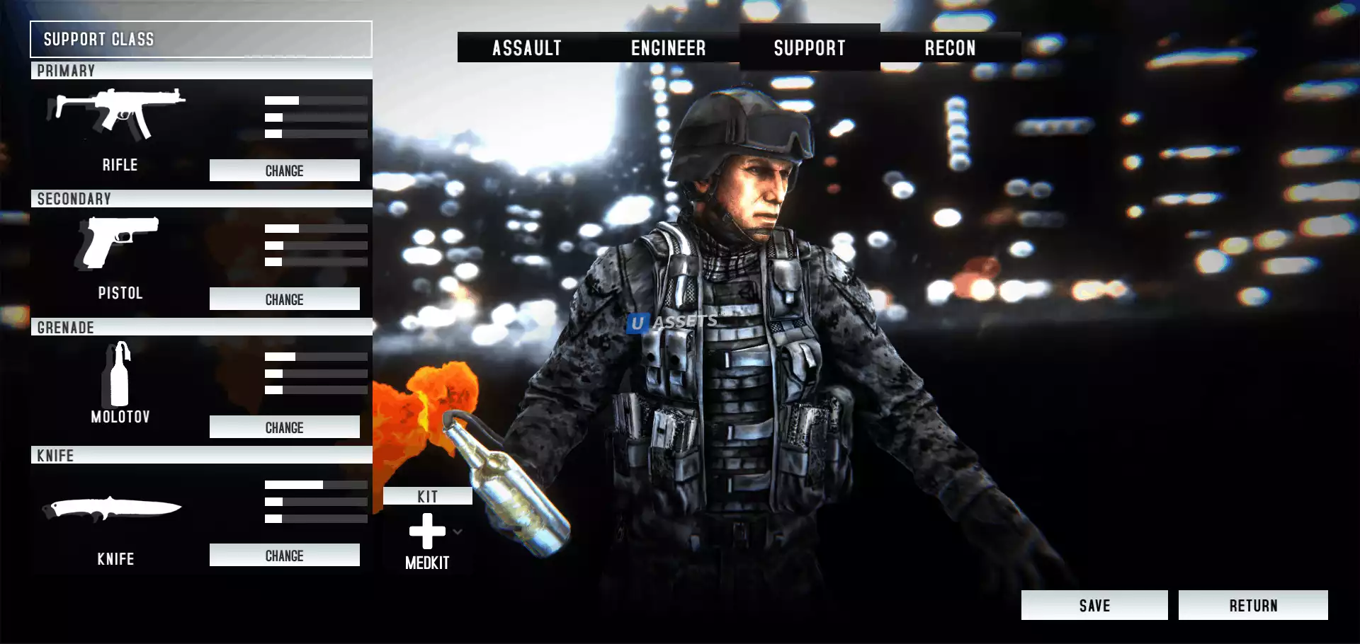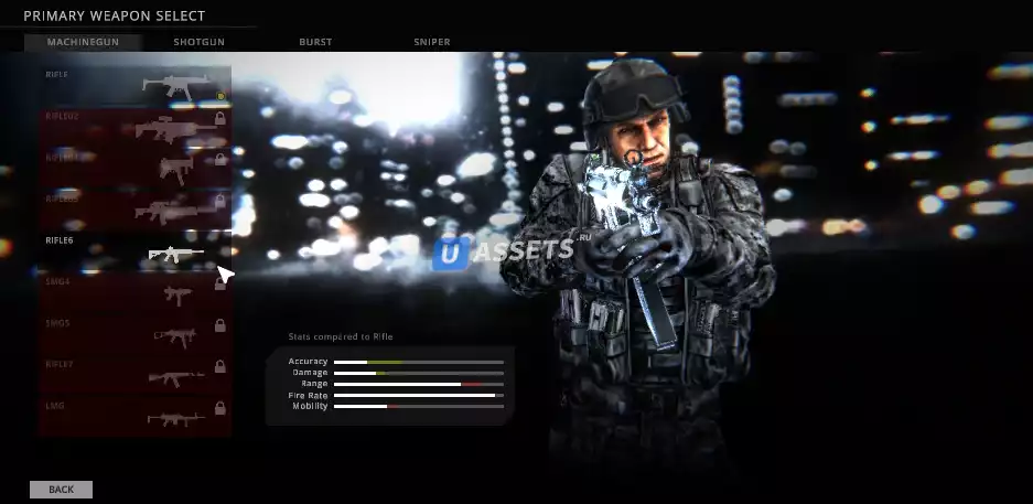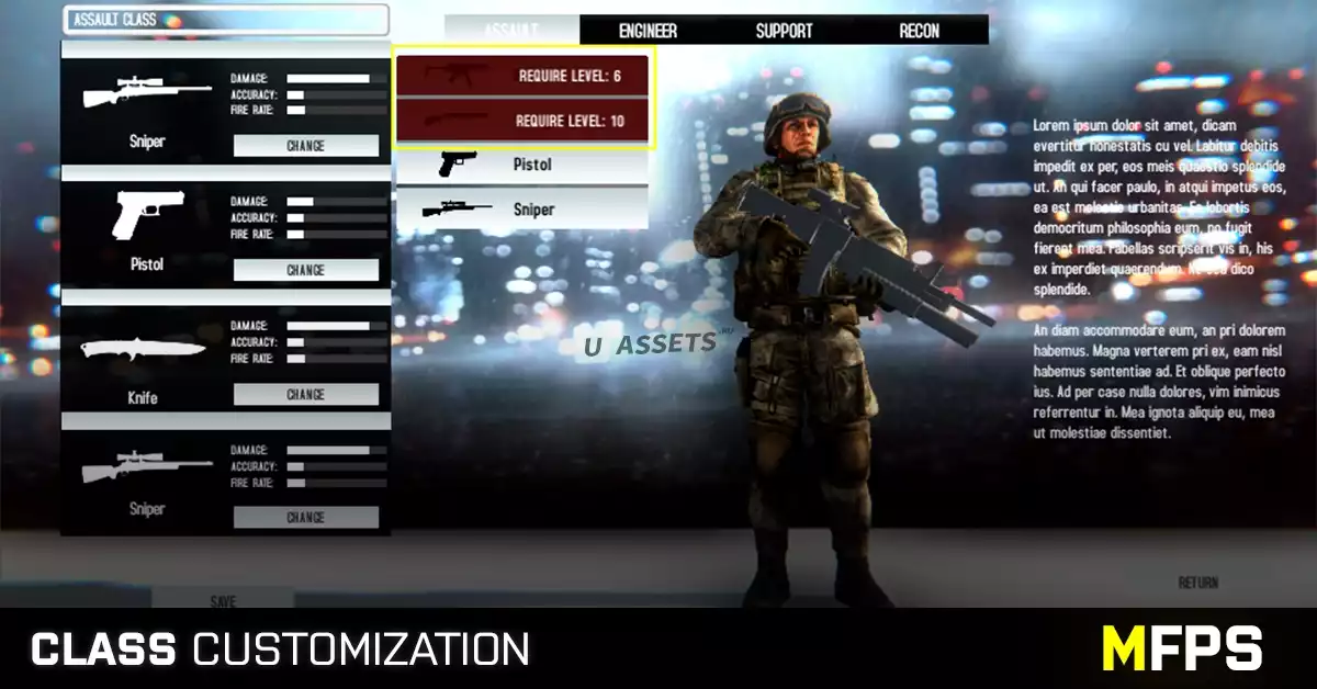 пользовательская загрузка каждого класса будет храниться локально или в базе данных, если используется uLogin Pro, и загружается, когда игрок снова входит в игру, благодаря приятному интерфейсу пользовательского интерфейса, вы можете без проблем повторно настроить его по своему усмотрению, вы также можете настроить, какое оружие будет доступно для каждого класса игроков.