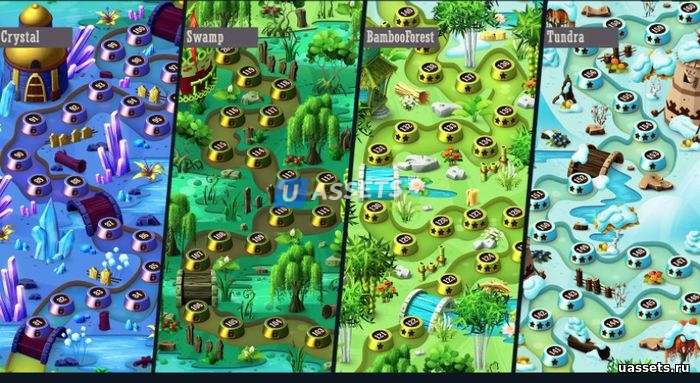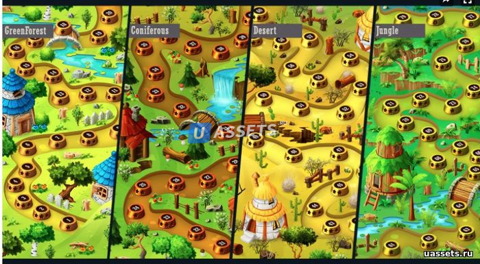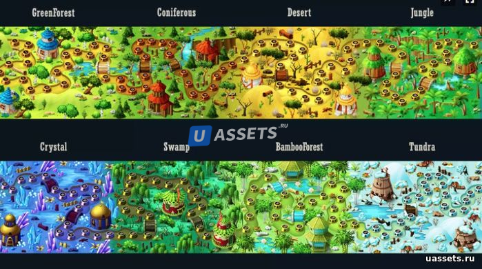 • * 280 элементов карты для 8 биомов: Зеленый лес, Хвойный, Пустыня, Джунгли, Кристалл, Болото, Бамбуковый лес, Тундра, в формате PNG и PSD, готовые к кодированию;