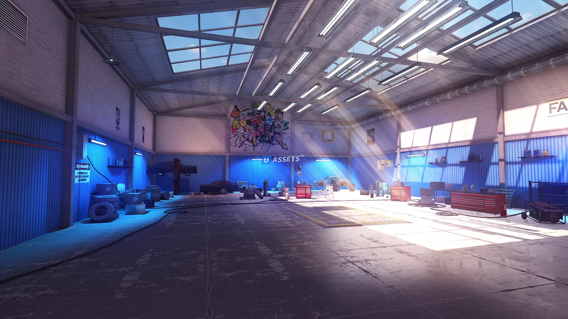 Модели гаражей имеют единую сетку и разделены на множество частей, чтобы сократить количество вызовов отрисовки.