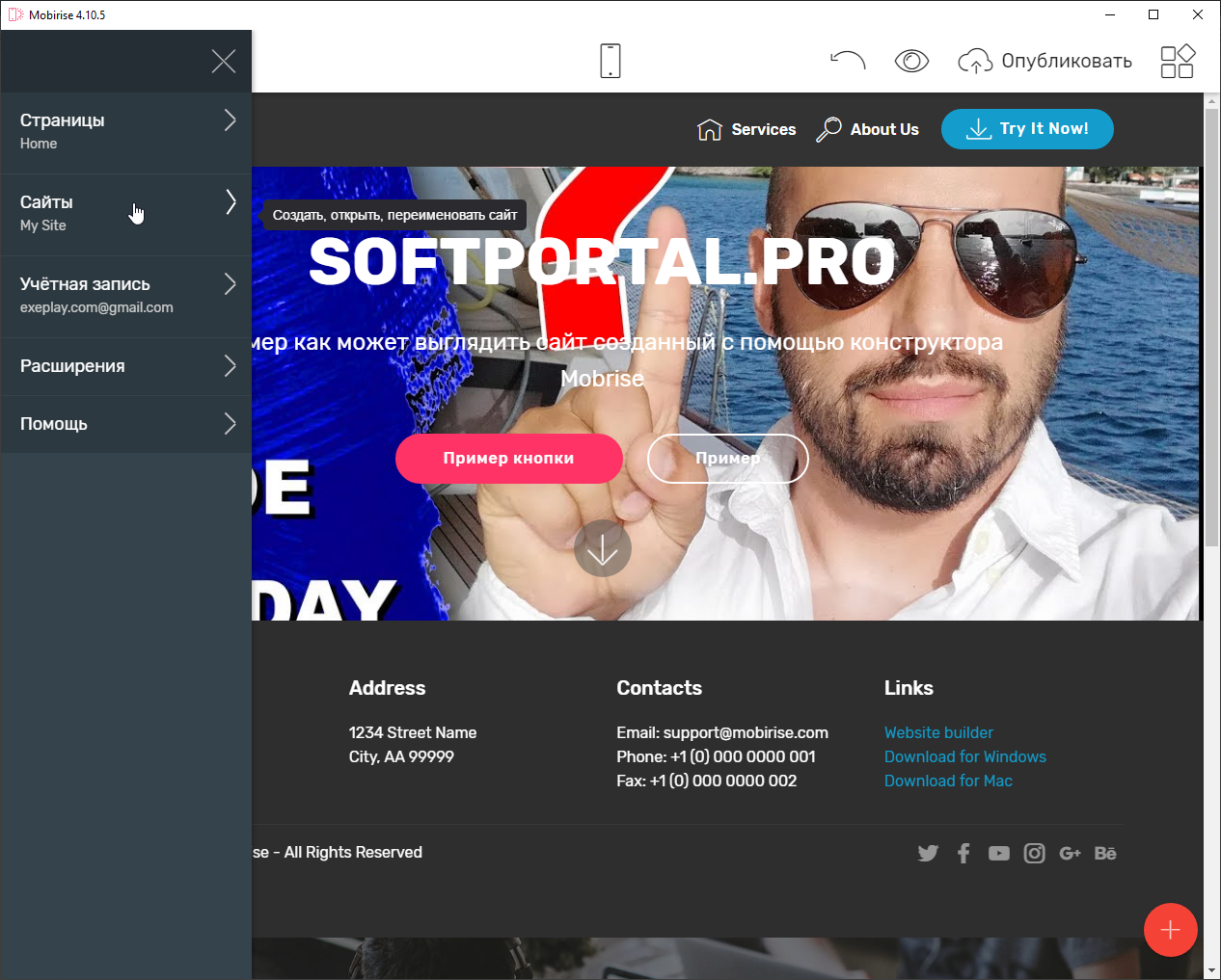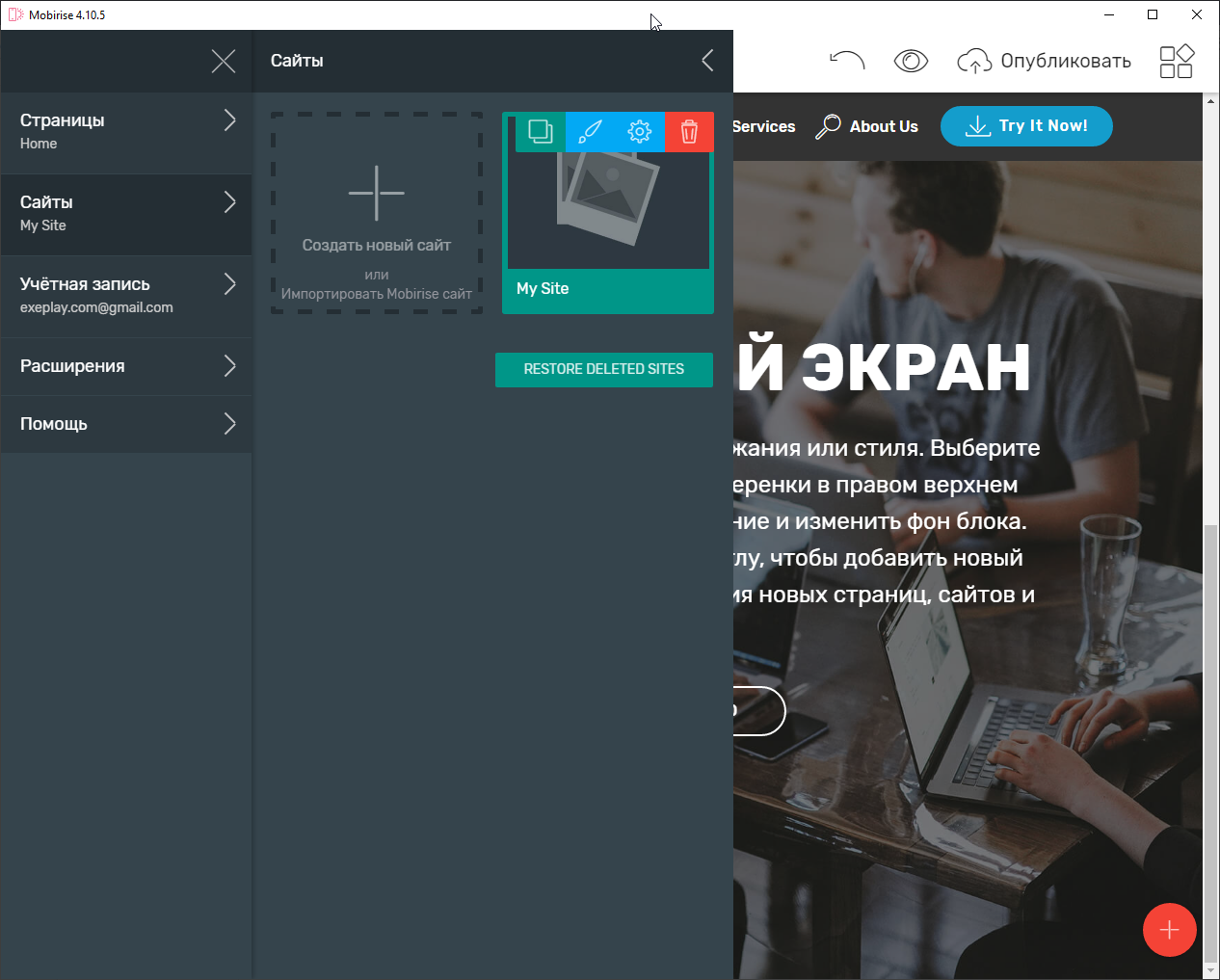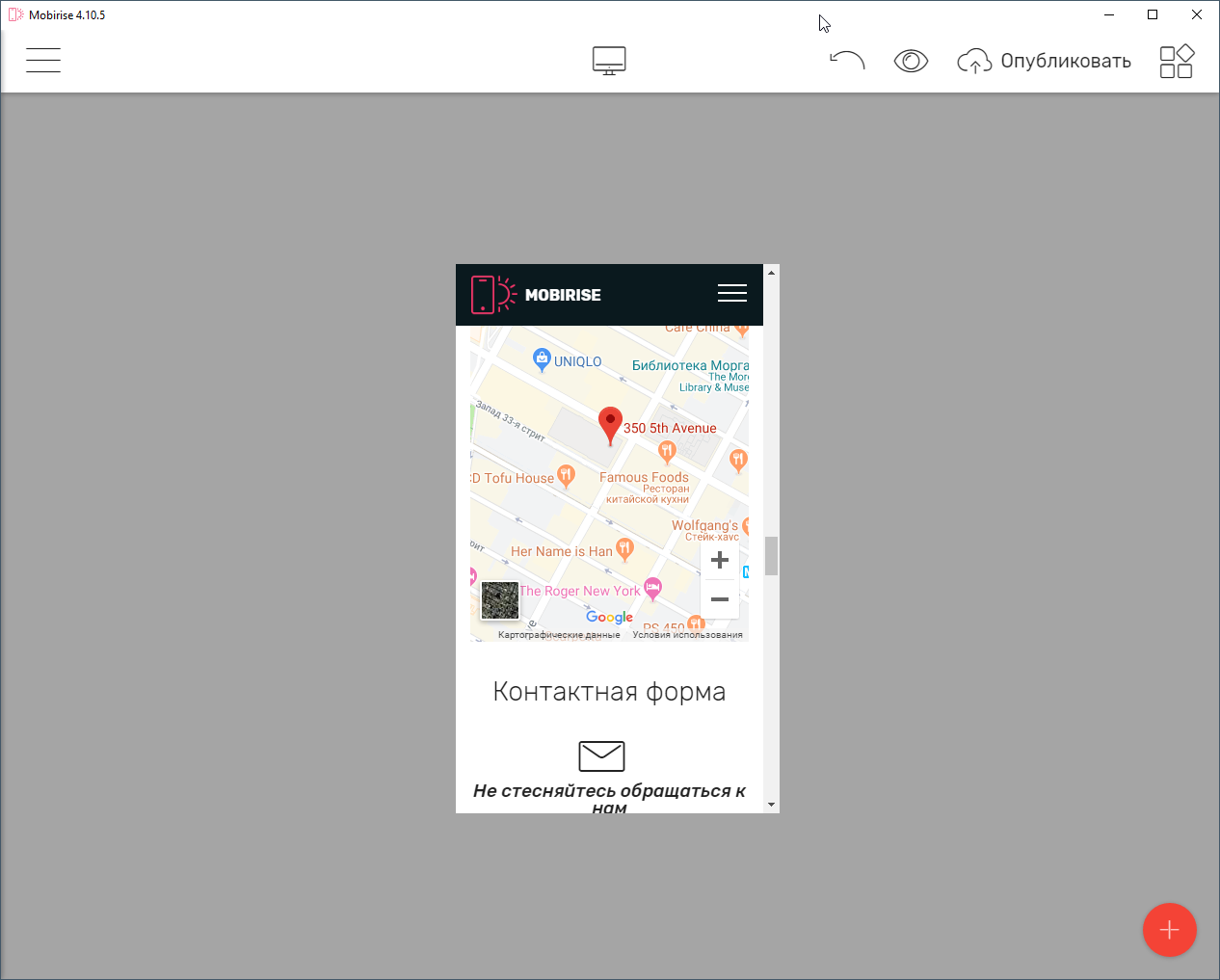 Хочу обратить внимание на одну как мне показалось интересную возможность — это выгрузка результатов работы на сайт mobirise.com, точнее публикация происходит на домен третьего уровня, например, my-page.mobirise.com сразу же доступен к просмотру из любой точки мира.