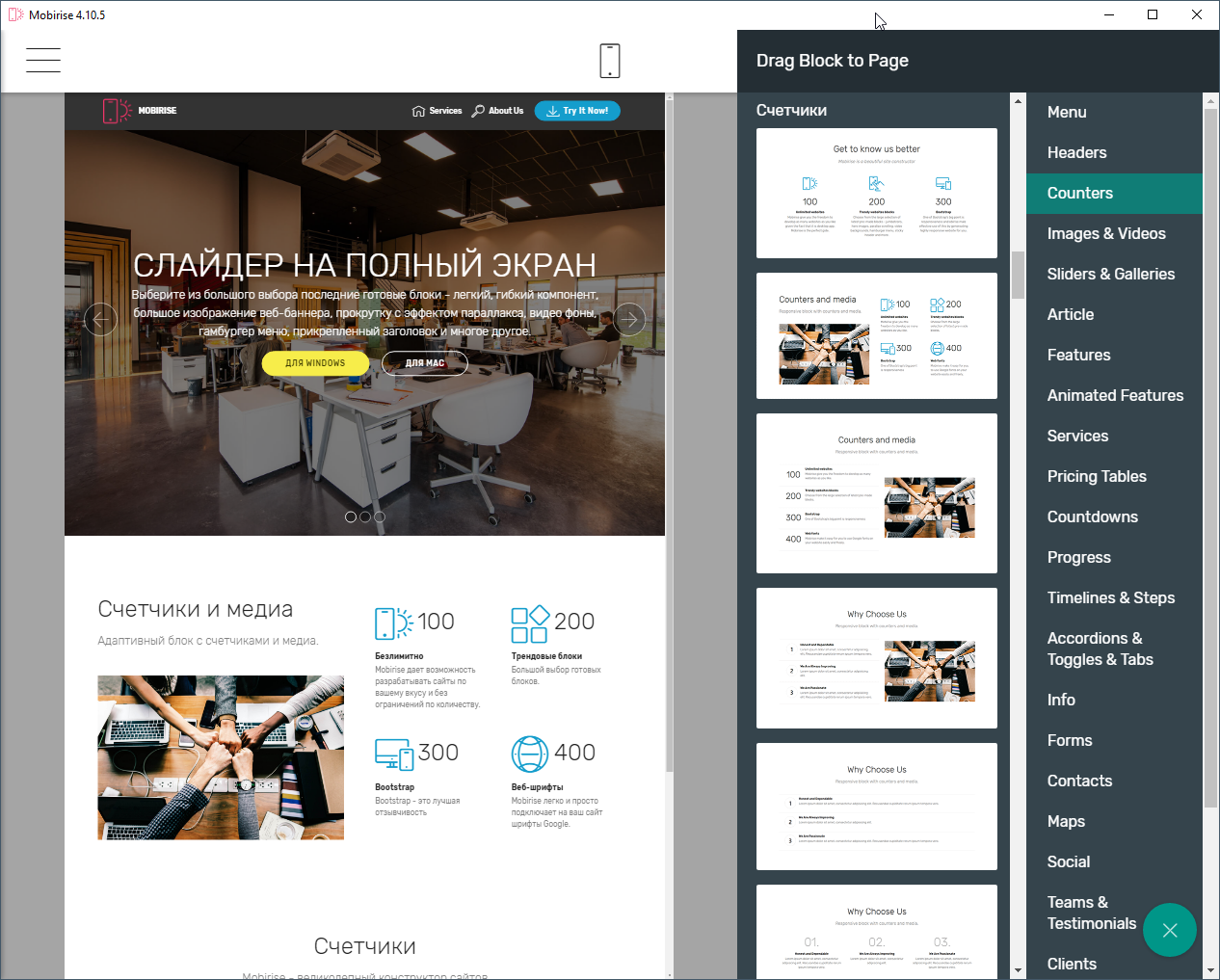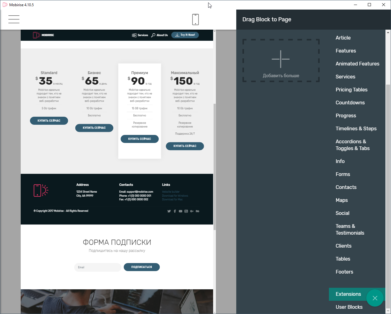Mobirise – мощный бесплатный инструмент (конструктор) для быстрого и качественного создания красивых статичных веб сайтов, который не требует от пользователя знаний веб программирования, различных языков, и разметок, а просто предлагает удобный визуальный конструктор с огромным количеством заготовок, от меню навигации до полностью готовых HTML шаблонов.