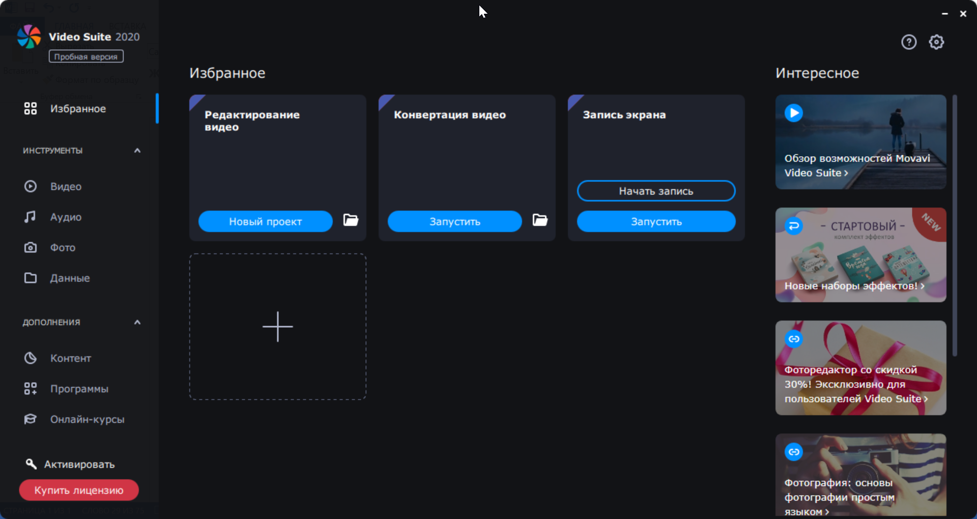 Movavi Video Suite состоит из нескольких инструментов, каждый из которых вносит свой вклад в рабочий процесс.
