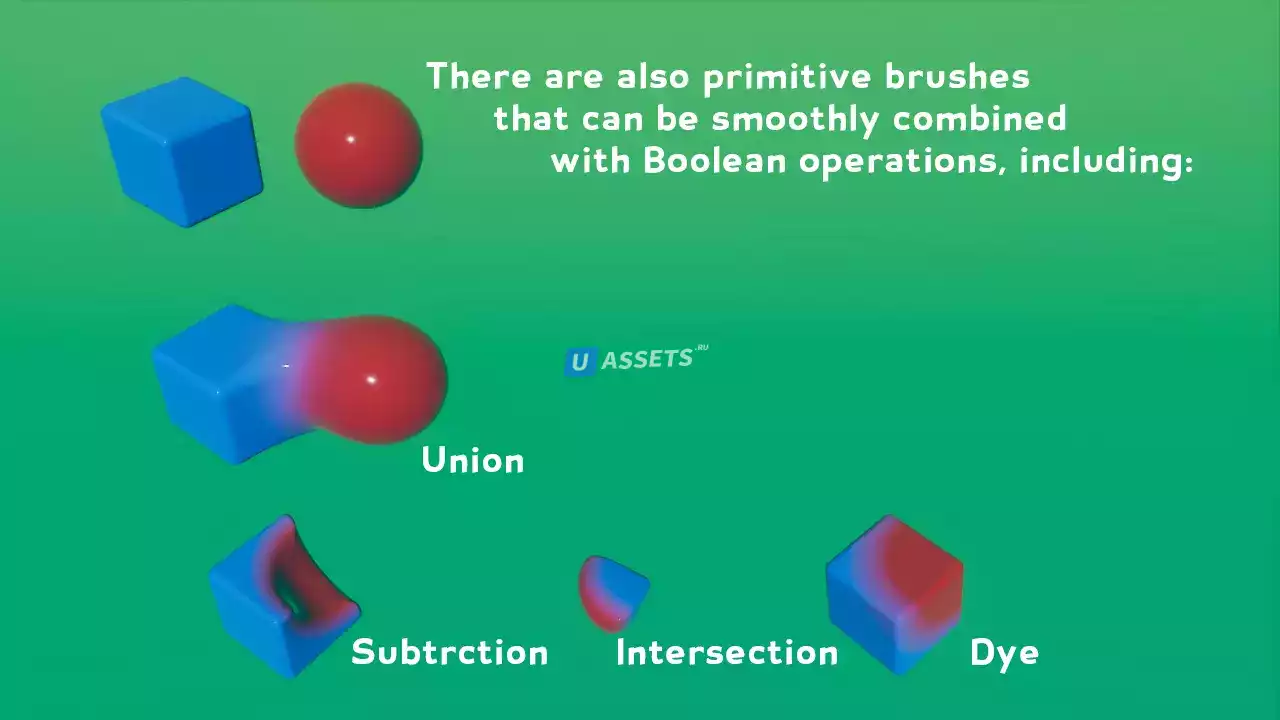 - Операторы кисти: объединение, вычитание, пересечение, окрашивание, отбраковка внутри, отбраковка снаружи, без операции.