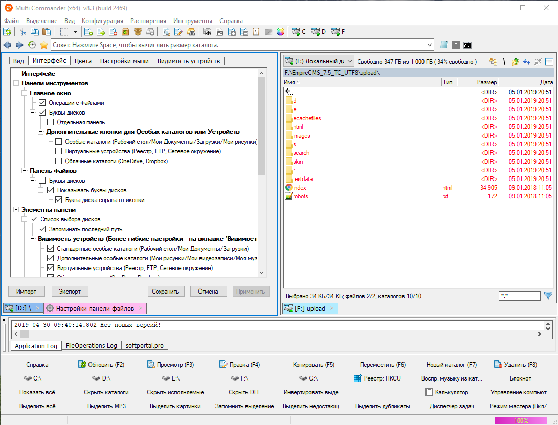 Интерфейс программы достаточно прост и располагает к пользователю, для тех, кто пользовался такими инструментами как Far manager, MC, Total commander, ничего нового для себя не увидит, все достаточно стандартно.