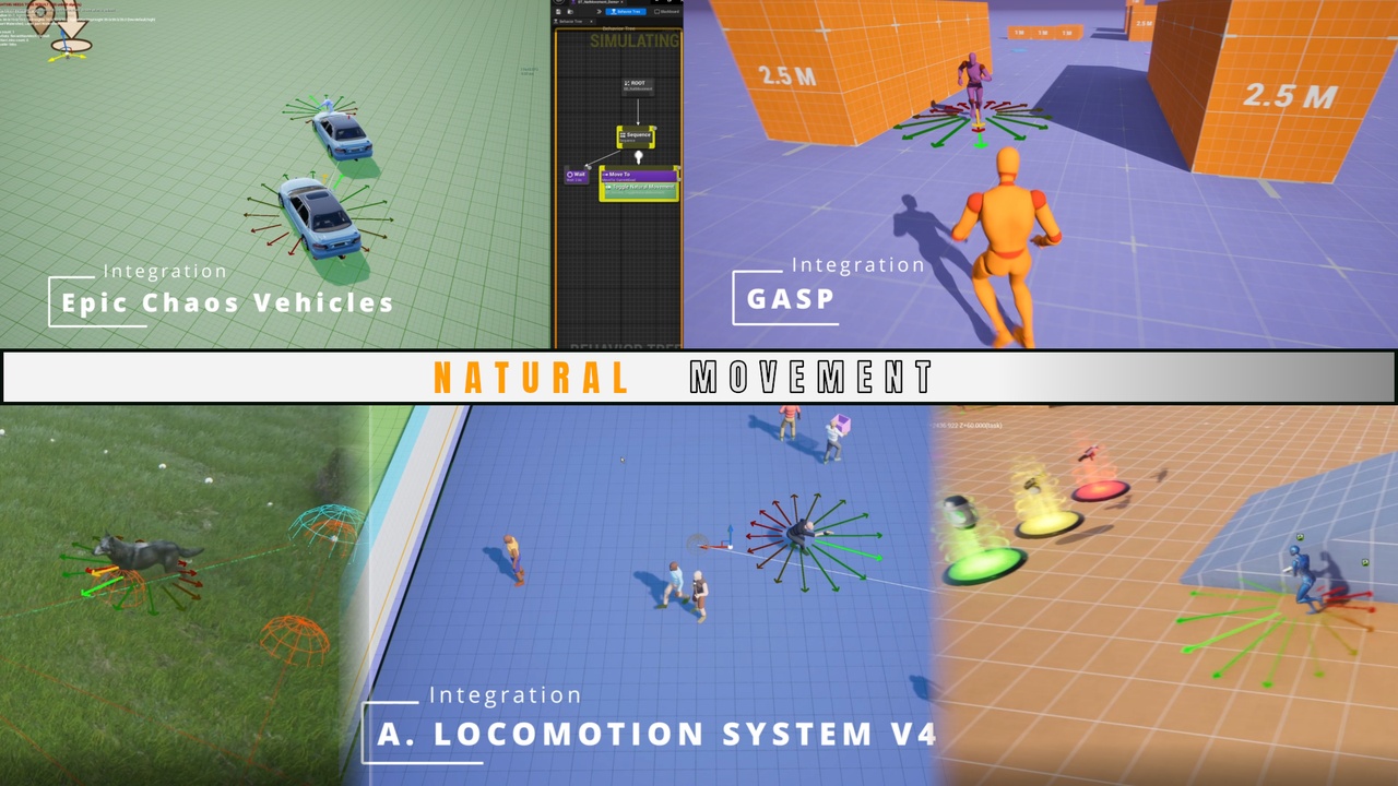 Интеграция с навигационной системой UE5 (NavMesh), чтобы персонажи AI могли правильно ориентироваться в пространстве и следовать по заданным маршрутам с плавными маневрами.