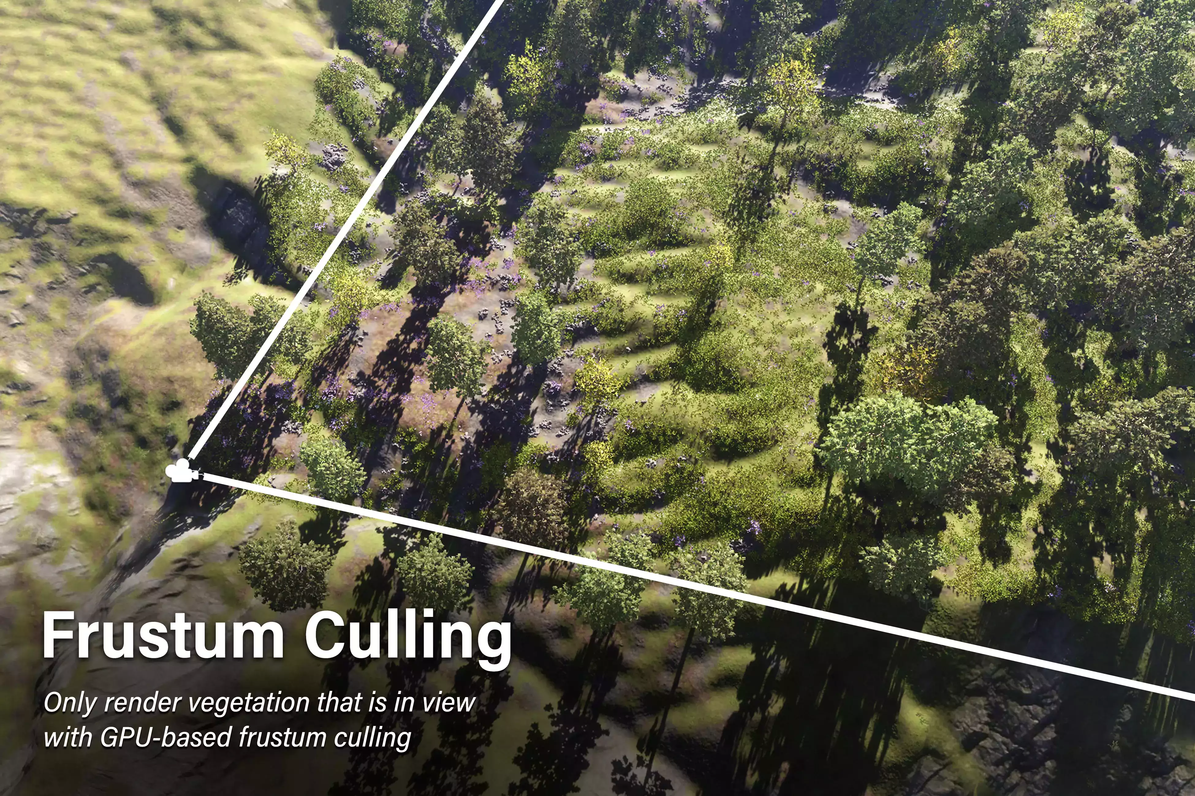Nature Renderer точно отбирает растительность, чтобы визуализировать только те объекты, которые находятся в поле зрения камеры. Отбор рассчитывается на графическом процессоре для обеспечения наилучшей производительности и точных результатов.