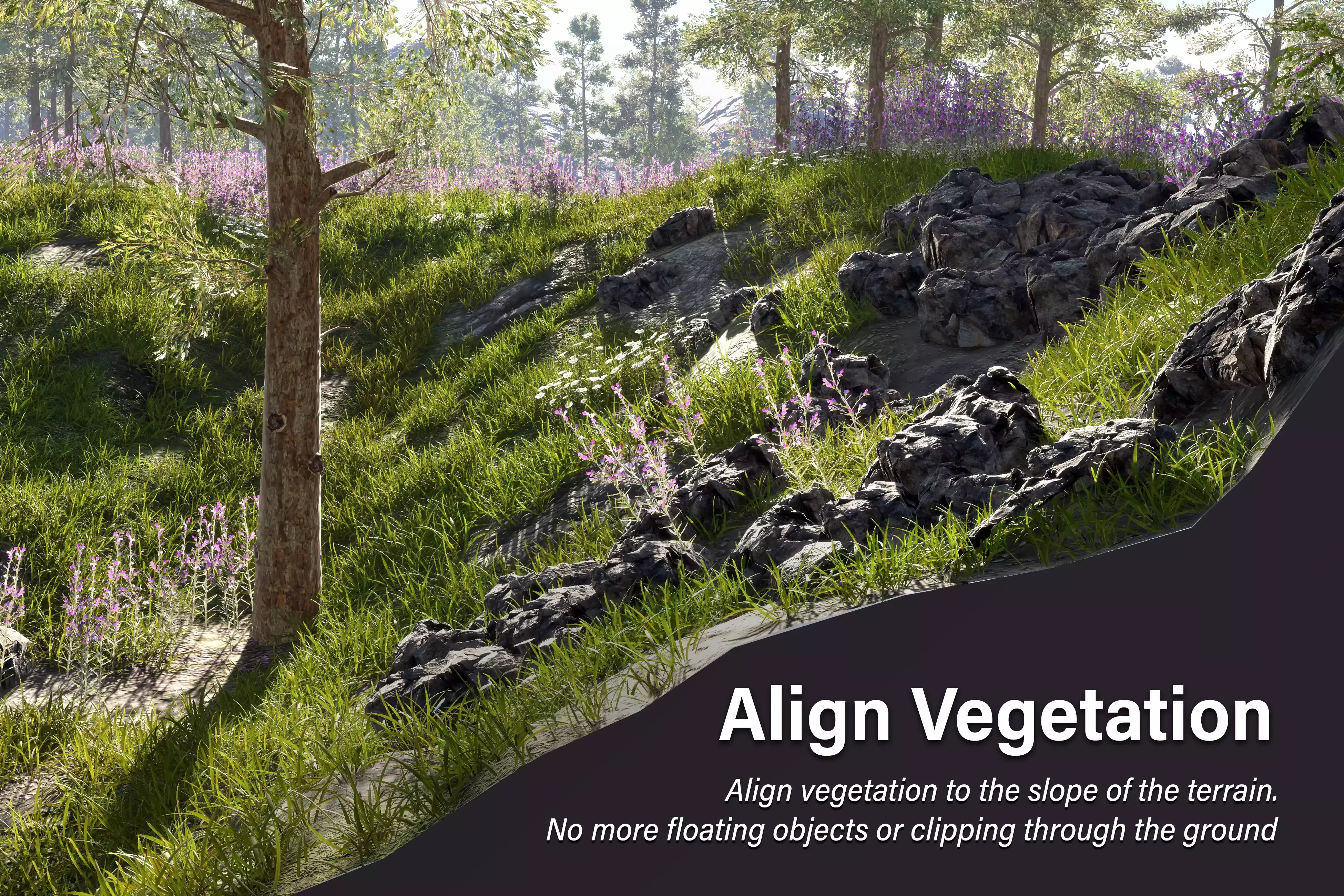Nature Renderer теперь может рендерить игровые объекты в одном и том же молниеносном конвейере рендеринга. Идеально подходит для размещения растительности на камнях, утесах и других неровных поверхностях, которые не поддерживаются системой ландшафта.
