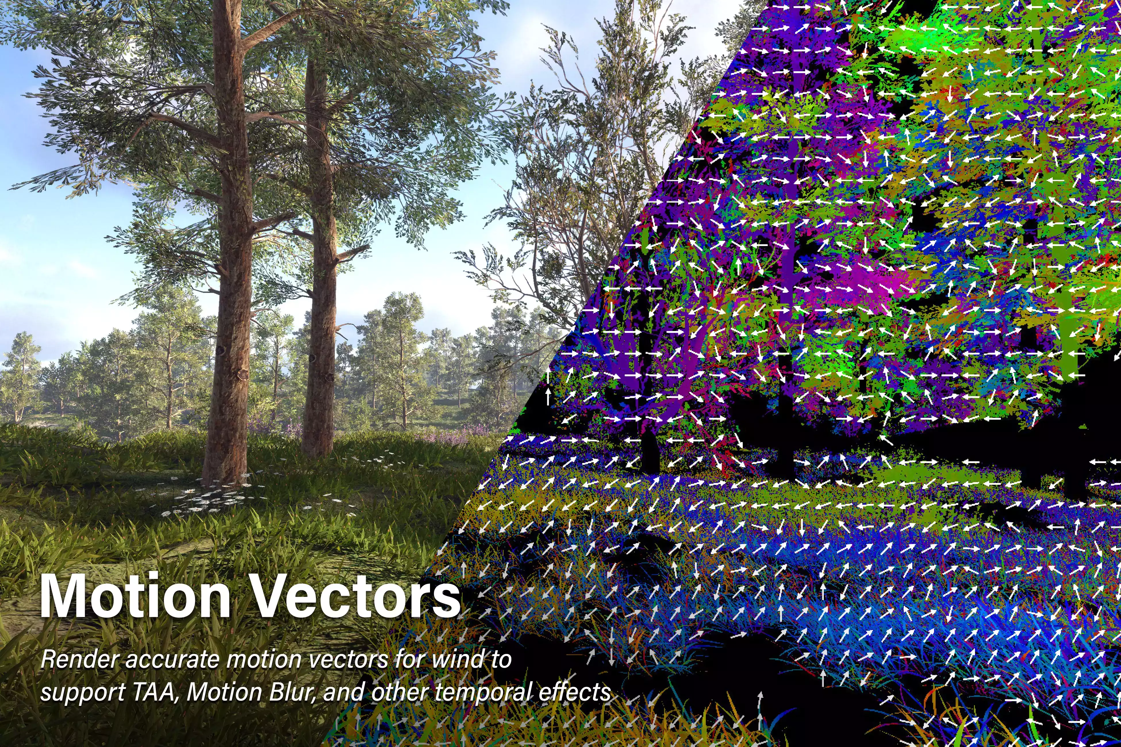 Nature Renderer может отображать точные векторы движения вашей растительности с поддержкой размытия в движении, временного сглаживания и других временных эффектов.