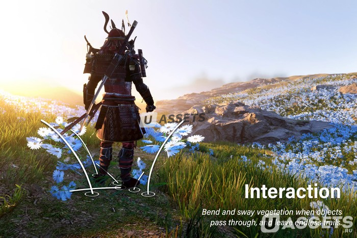 Давите траву, заставляйте растения раскачиваться и оставляйте след за предметами. Любой объект в сцене может взаимодействовать с растительностью. Единственное, что вам нужно сделать, это добавить коллайдер к объекту.
