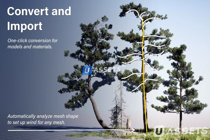 Сетки анализируются с использованием уникального алгоритма Nature Shaders для идентификации ветвей деревьев, листьев и других форм растительности. Эти формы затем используются для автоматической настройки ветра и взаимодействия. Нет необходимости в ручной настройке моделей или сеток.