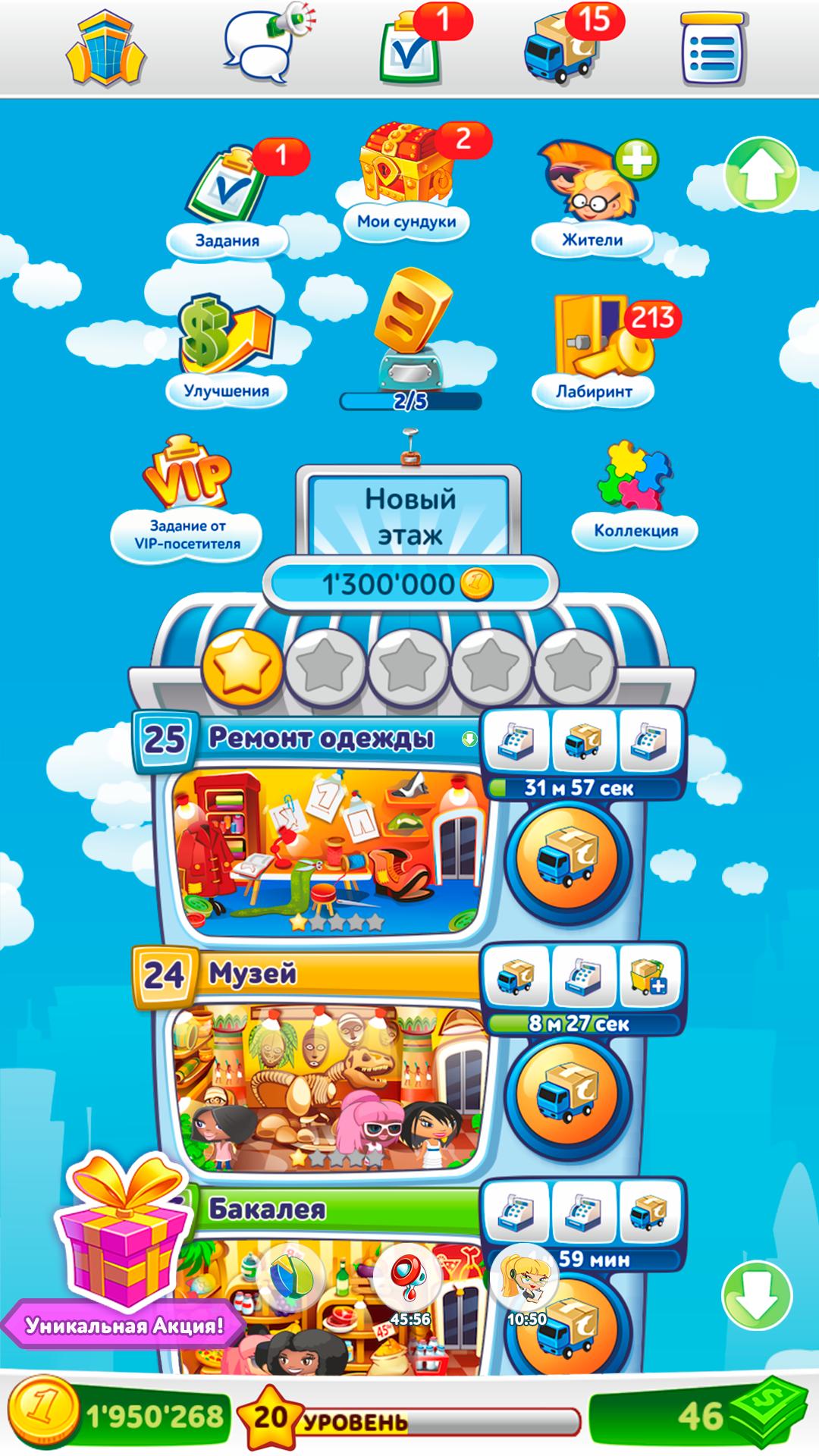 В вашем небоскребе есть специальный этаж для знаменитостей. Следите за лифтом, чтобы не пропустить визиты отечественных и зарубежных звезд. Их присутствие приносит дополнительную прибыль и престиж вашему бизнесу. Собирайте как можно больше знаменитостей, чтобы усилить успех вашего проекта «Небоскреб мечты».